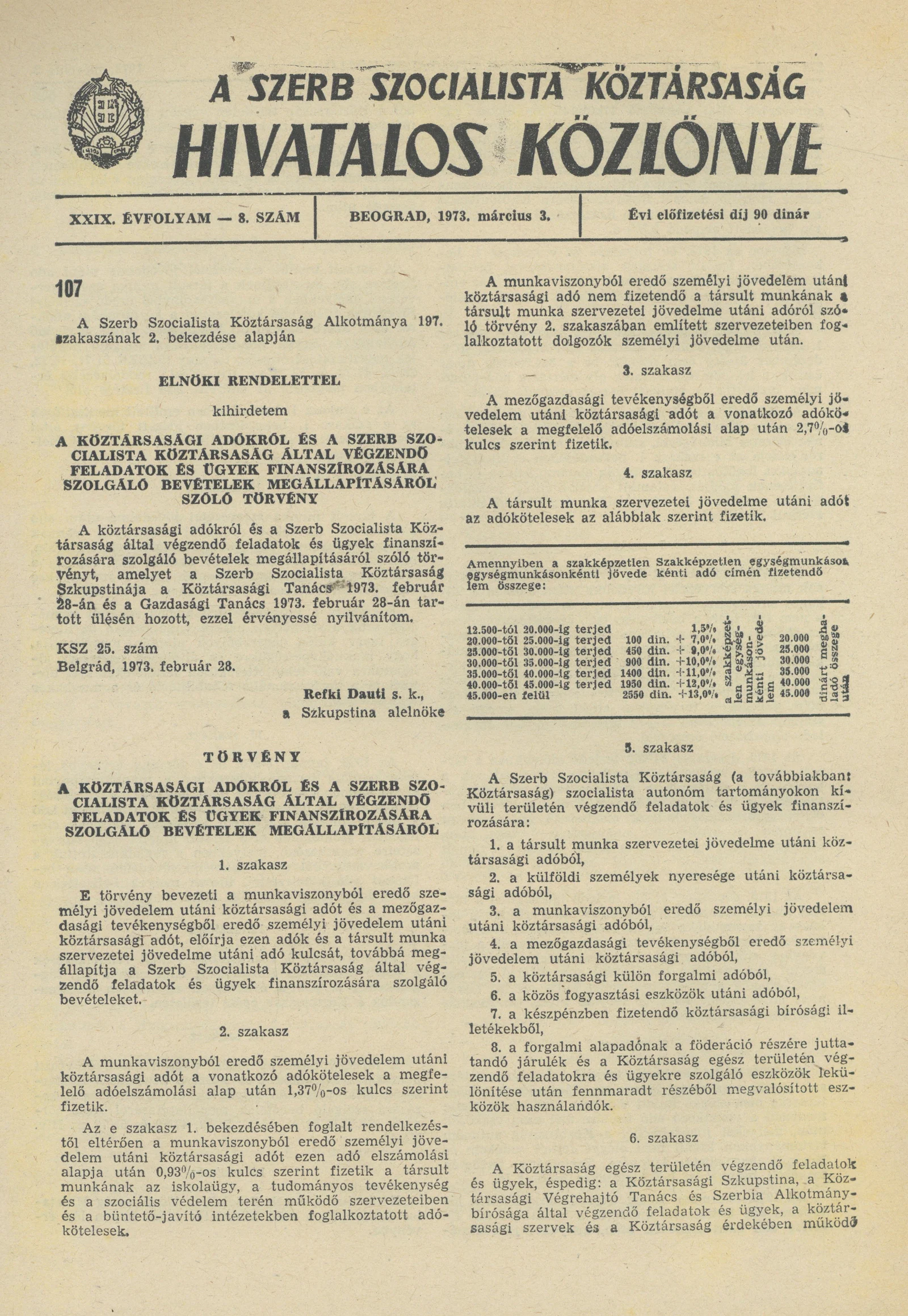 A Szerb Szocialista Köztársaság Hivatalos Közlönye, 29. évf. 1973. március 3. 8. sz. 273–280. oldal