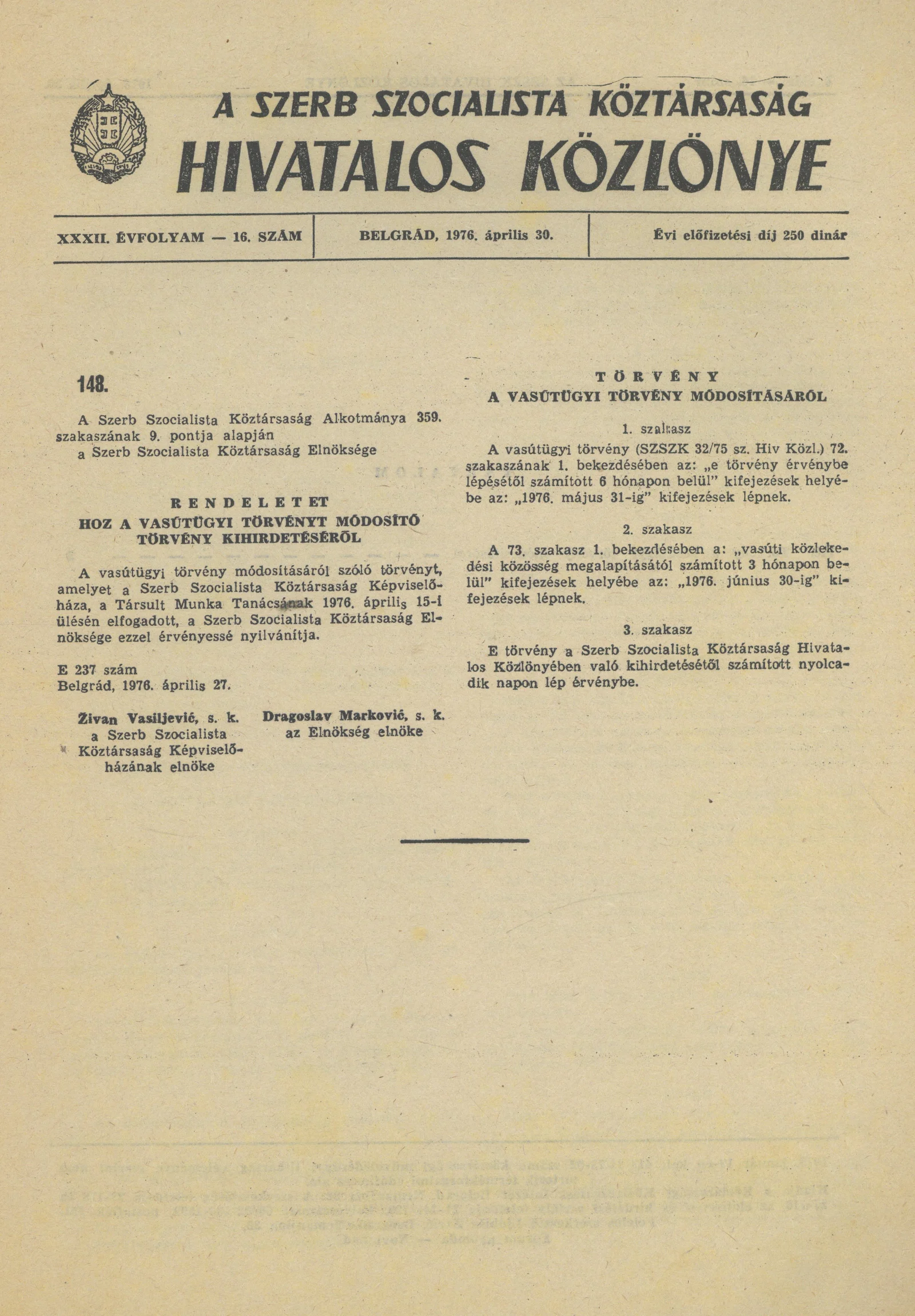 A Szerb Szocialista Köztársaság Hivatalos Közlönye, 32. évf. 1976. április 30. 16. sz. 3–4. oldal