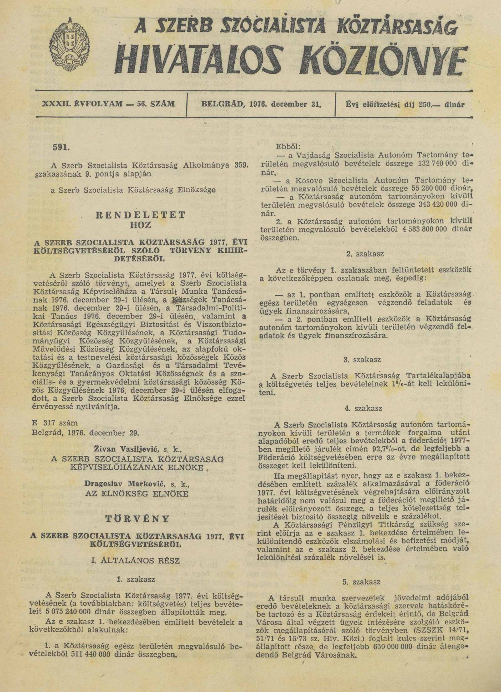 A Szerb Szocialista Köztársaság Hivatalos Közlönye, 32. évf. 1976. december 31. 56. sz. 2009–2048. oldal