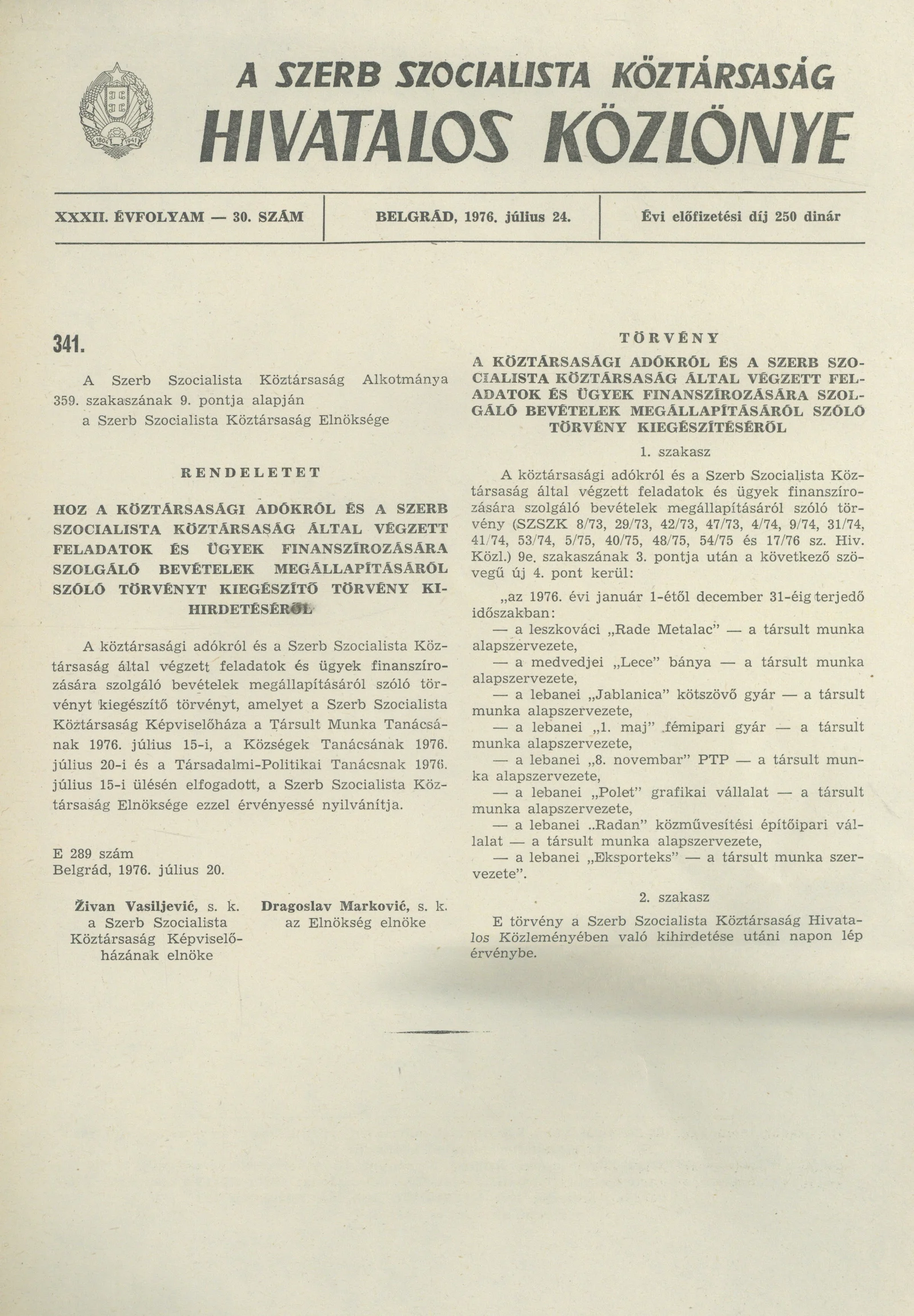 A Szerb Szocialista Köztársaság Hivatalos Közlönye, 32. évf. 1976. július 24. 30. sz. 3–4. oldal