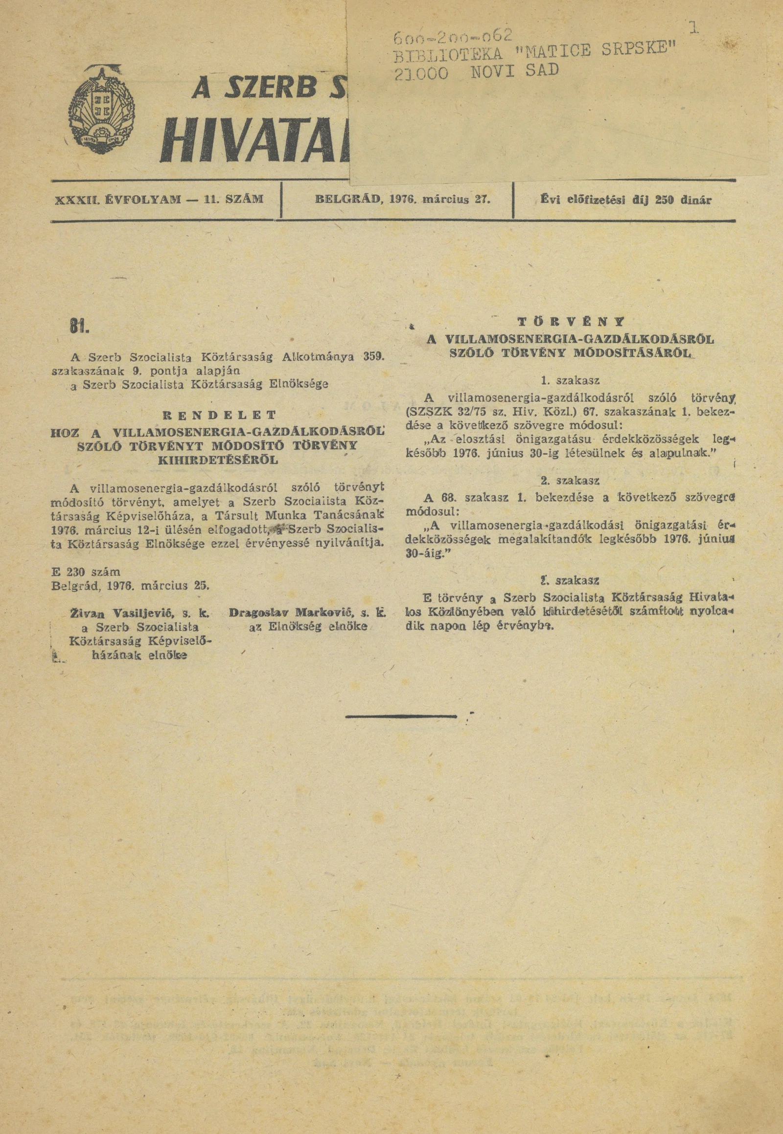 A Szerb Szocialista Köztársaság Hivatalos Közlönye, 32. évf. 1976. március 27. 11. sz. 1–2. oldal
