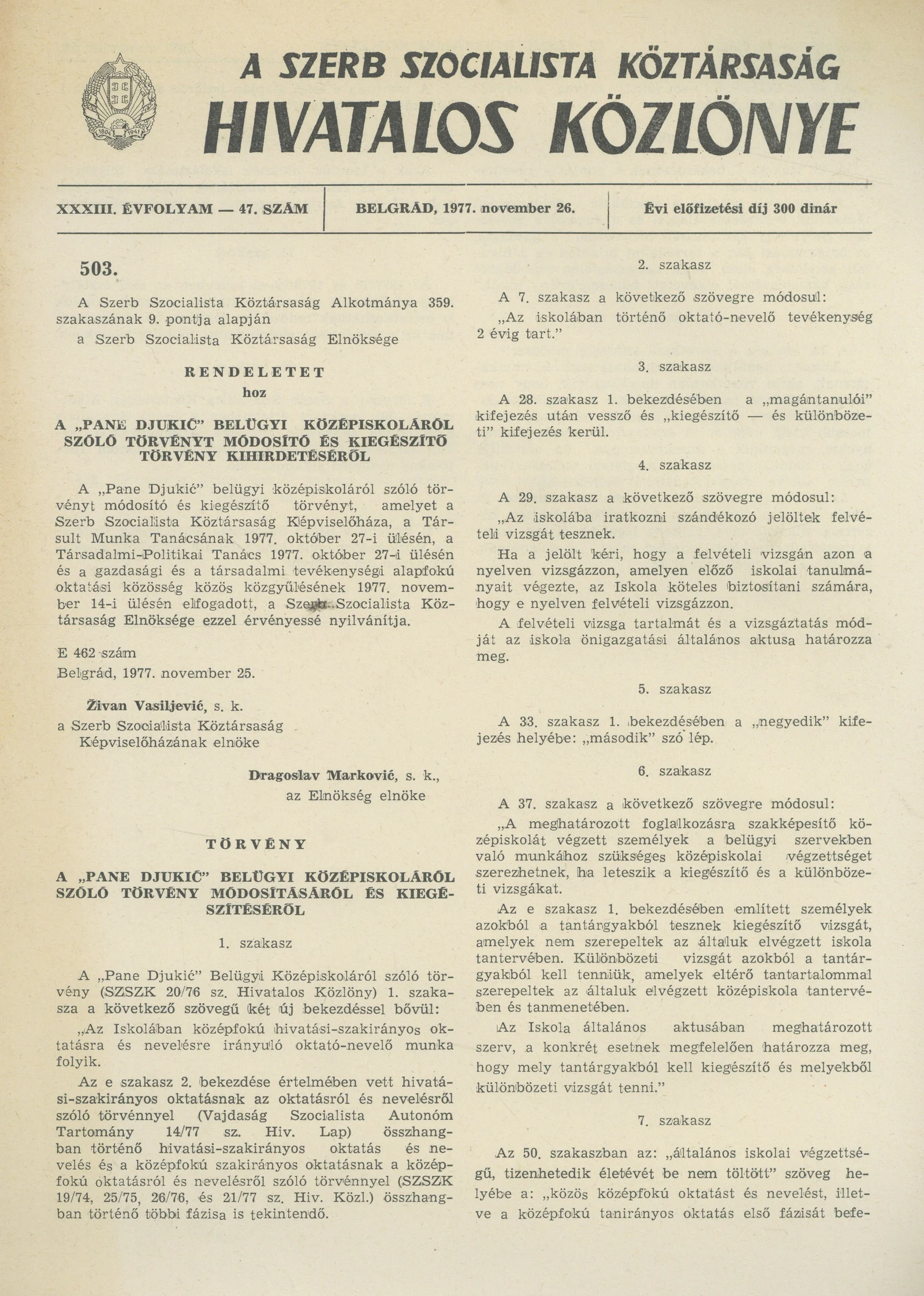 A Szerb Szocialista Köztársaság Hivatalos Közlönye, 33. évf. 1977. november 26. 47. sz. 2377–2380. oldal