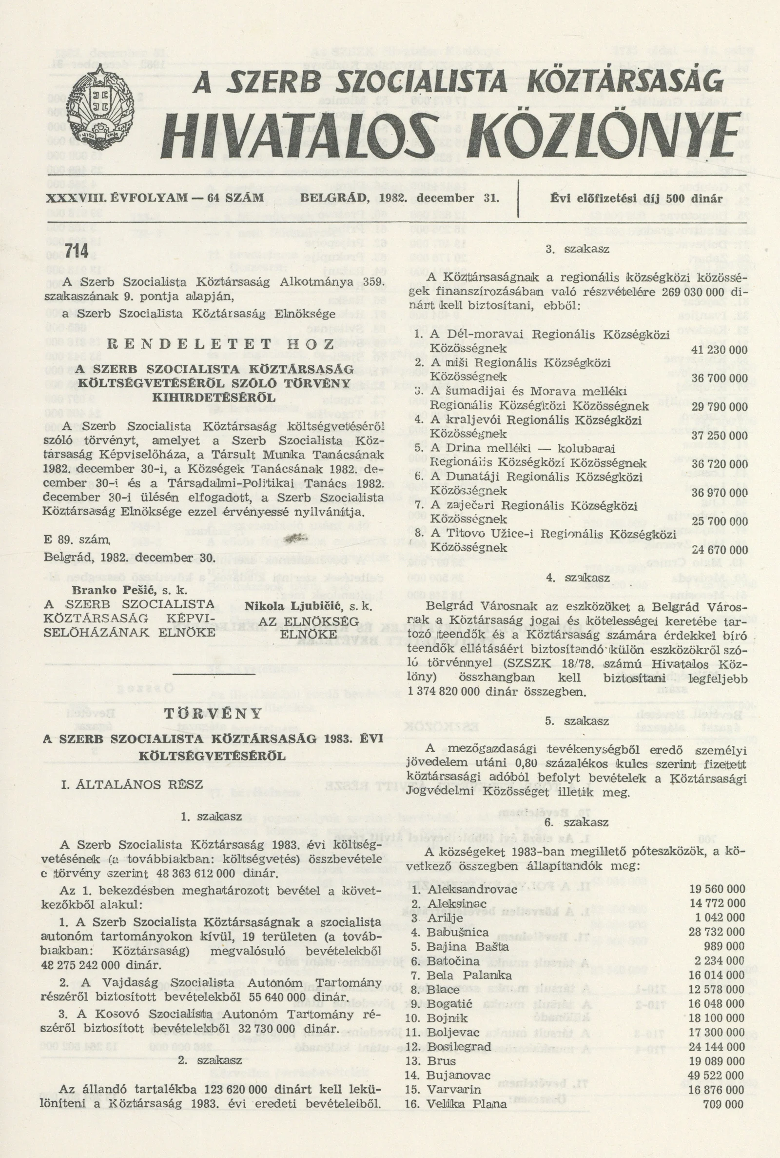 A Szerb Szocialista Köztársaság Hivatalos Közlönye, 38. évf. 1982. december 31. 64. sz.