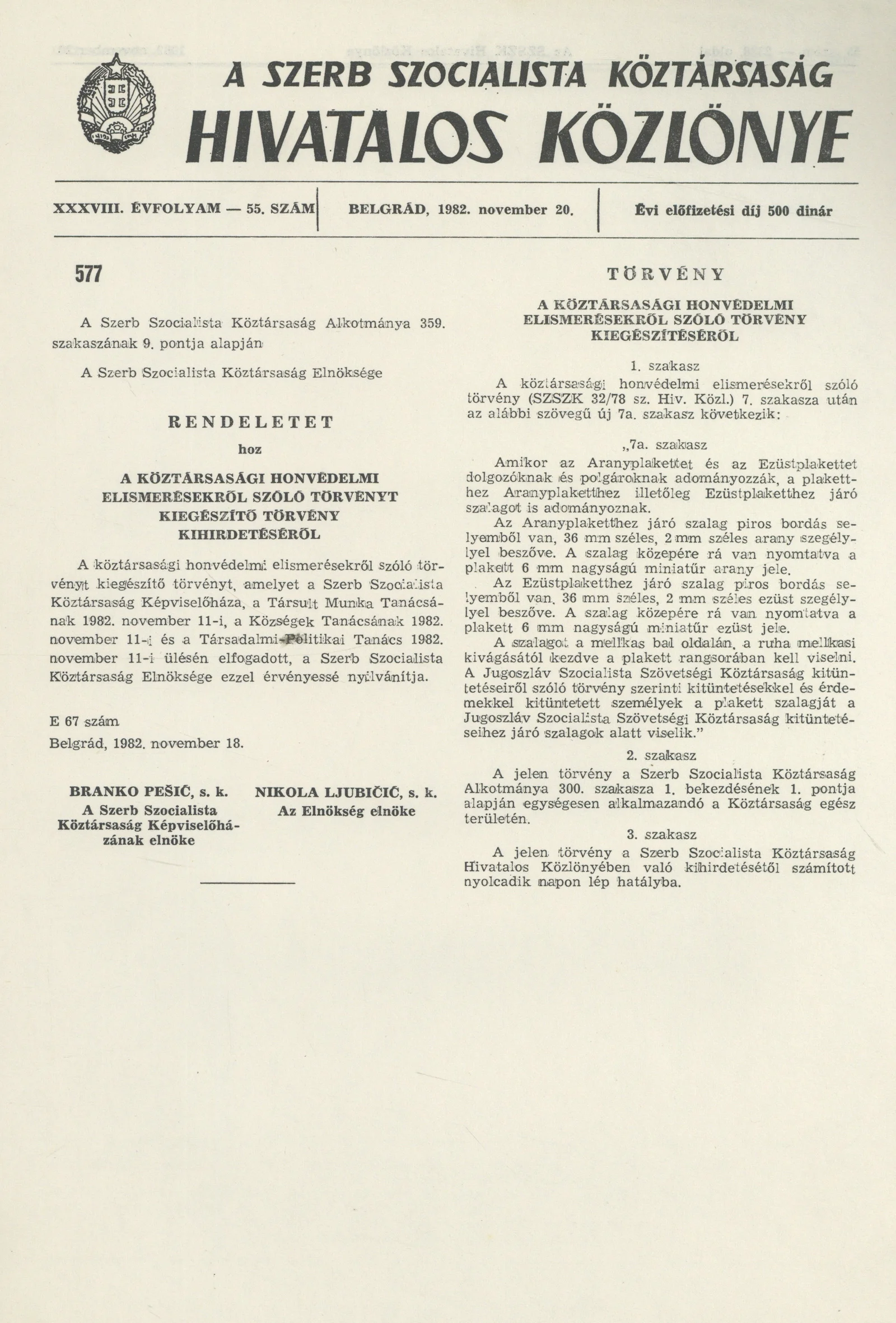 A Szerb Szocialista Köztársaság Hivatalos Közlönye, 38. évf. 1982. november 20. 55. sz.