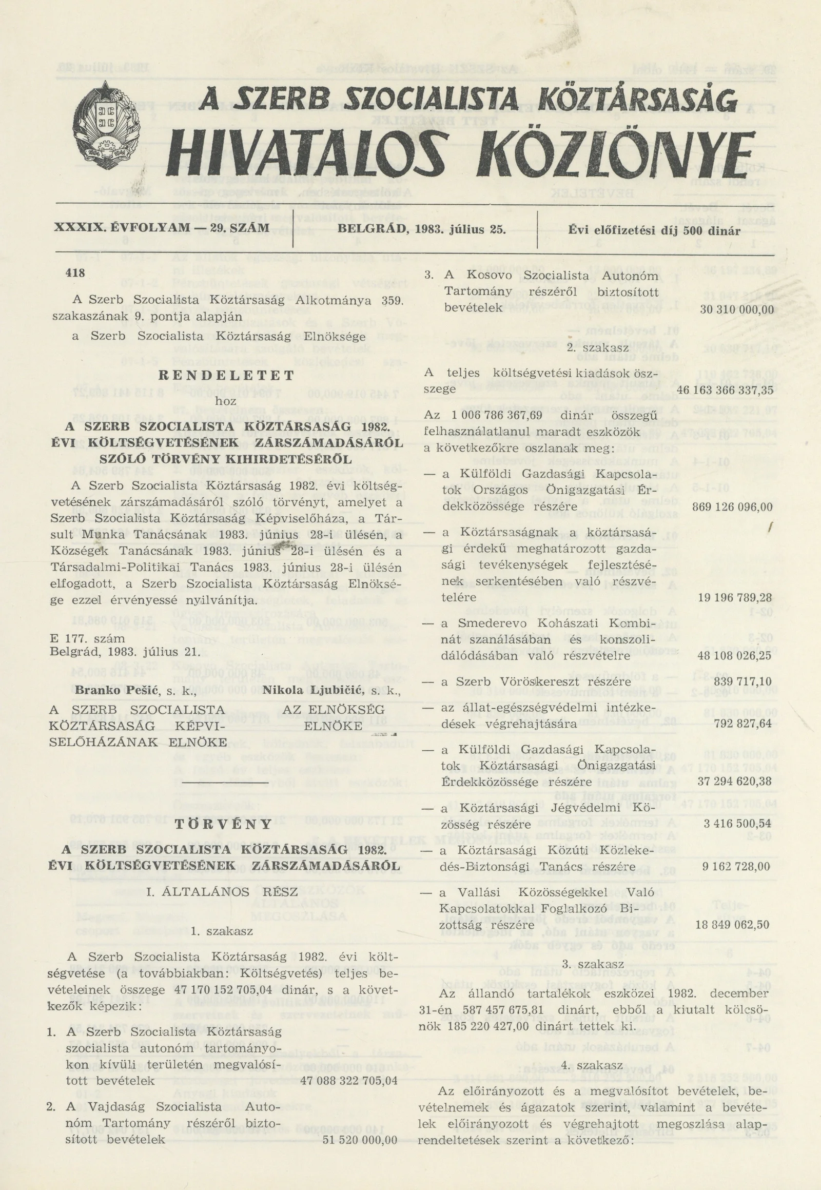 A Szerb Szocialista Köztársaság Hivatalos Közlönye, 39. évf. 1983. július 25. 29. sz.