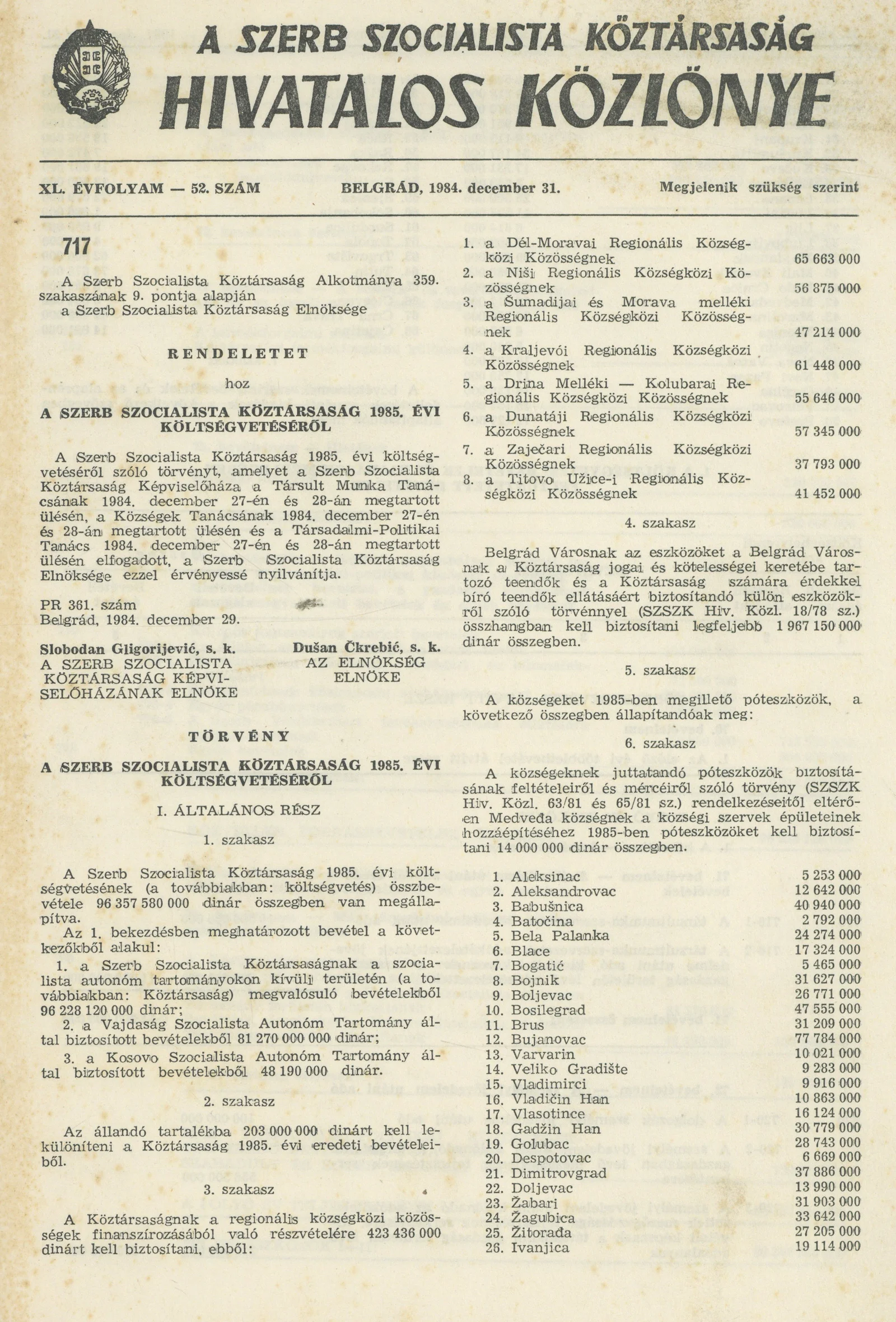 A Szerb Szocialista Köztársaság Hivatalos Közlönye, 40. évf. 1984. december 31. 52. sz.