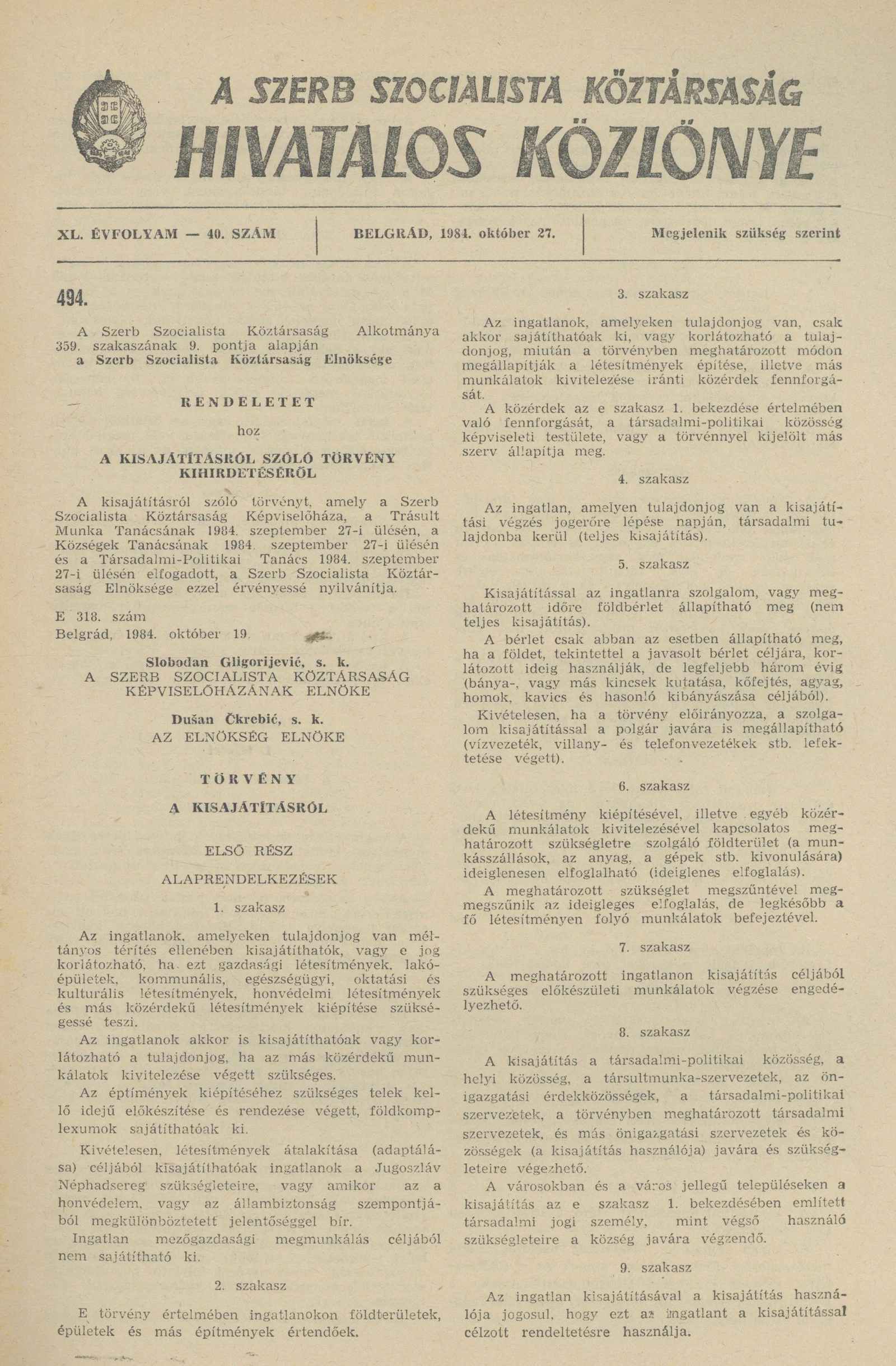 A Szerb Szocialista Köztársaság Hivatalos Közlönye, 40. évf. 1984. október 27. 40. sz.