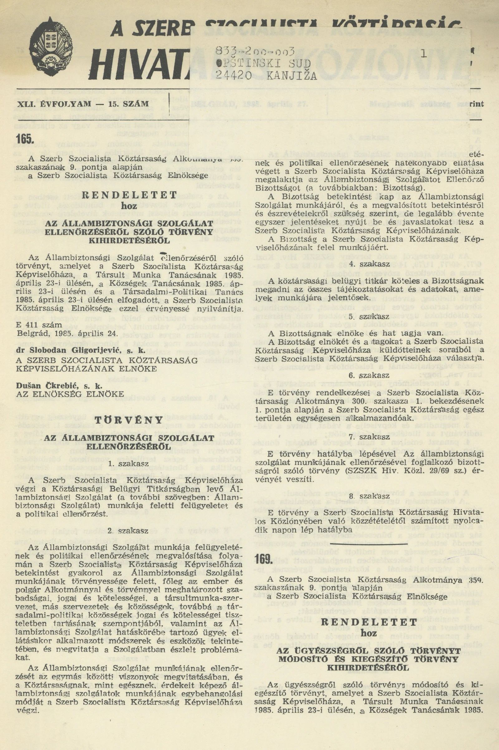 A Szerb Szocialista Köztársaság Hivatalos Közlönye, 41. évf. 1985. április 27. 15. sz.