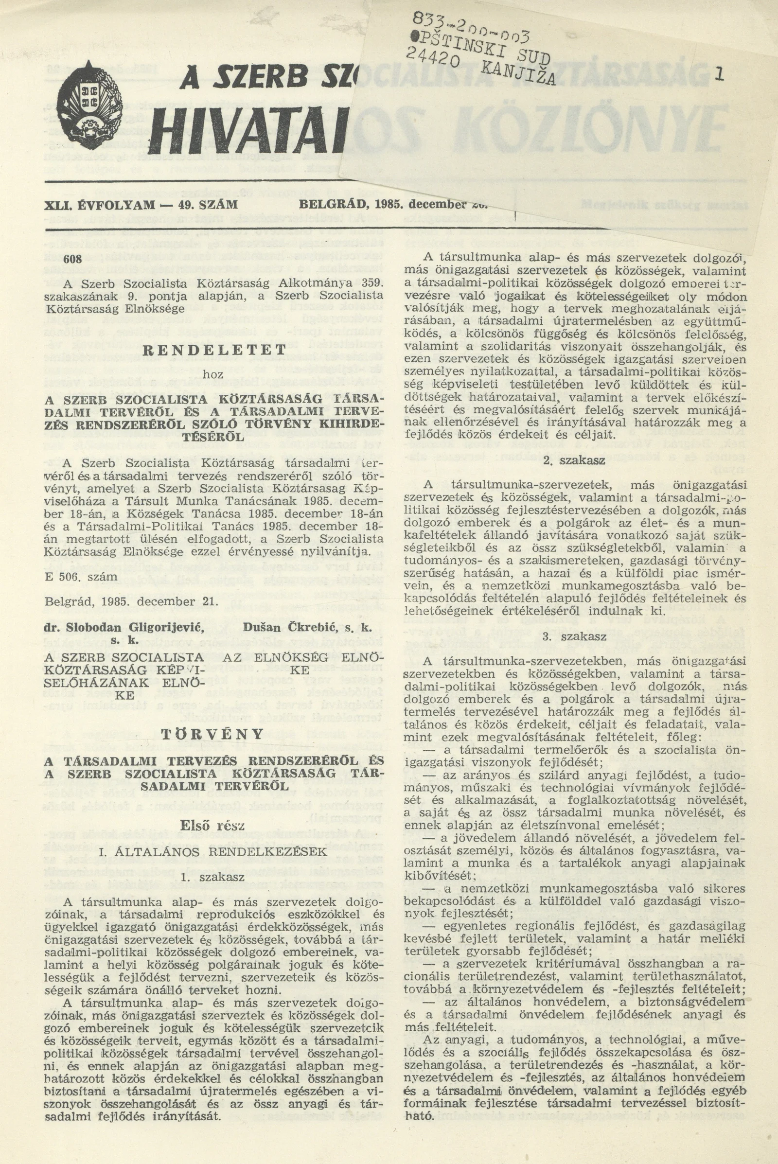 A Szerb Szocialista Köztársaság Hivatalos Közlönye, 41. évf. 1985. december 26. 49. sz.