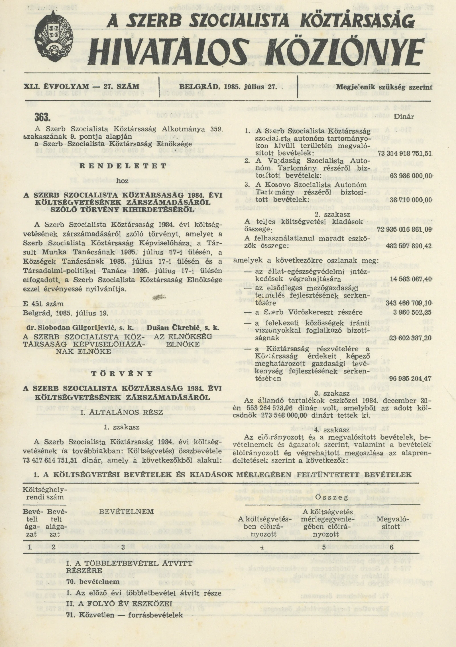 A Szerb Szocialista Köztársaság Hivatalos Közlönye, 41. évf. 1985. július 27. 27. sz.