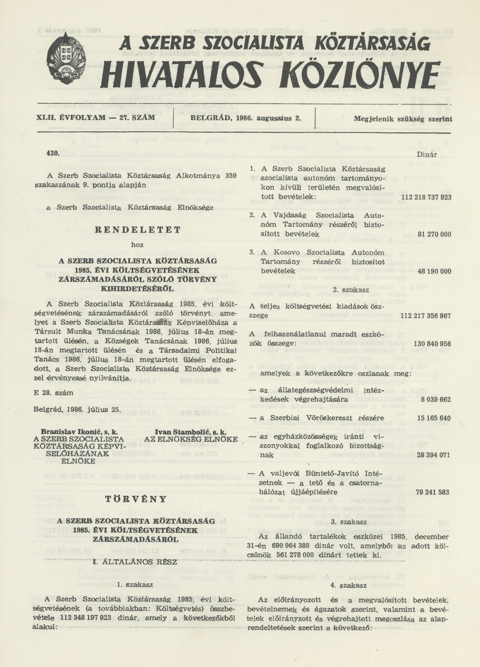 A Szerb Szocialista Köztársaság Hivatalos Közlönye, 42. évf. 1986. augusztus 2. 27. sz.