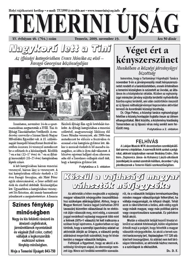 Temerini Újság, 15. évf. 2009. november 19. 46. sz.