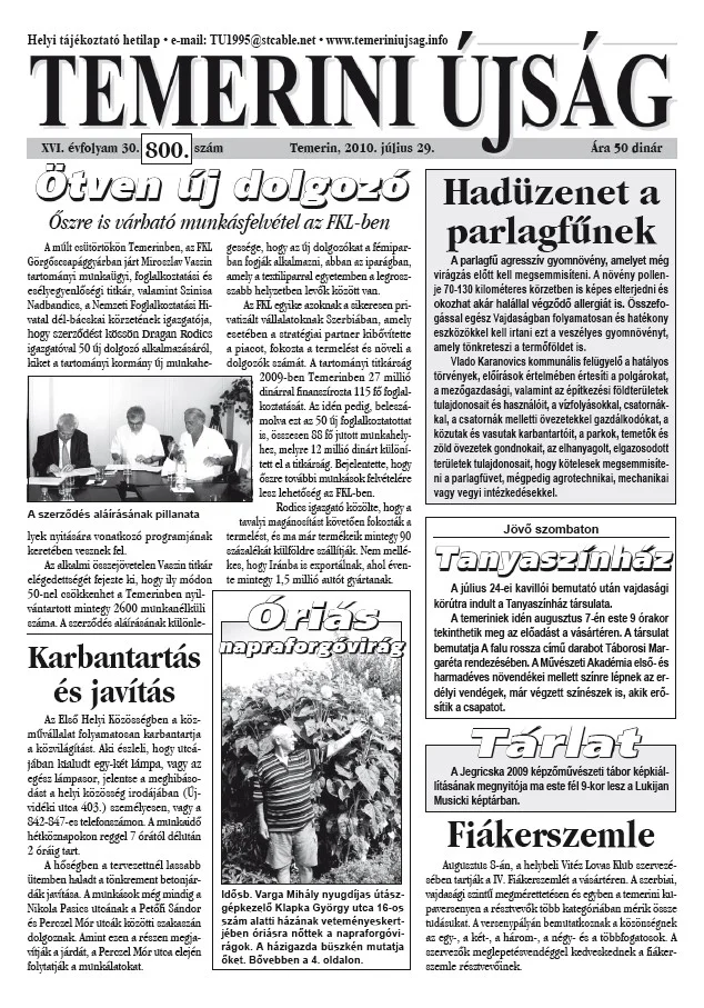 Temerini Újság, 16. évf. 2010. július 29. 30. sz.