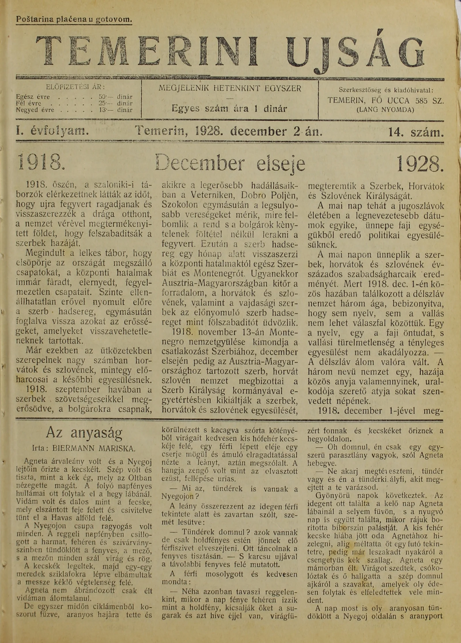 Temerini Újság 1928-1944, 1. évf. 1928. december 2. 14. sz.