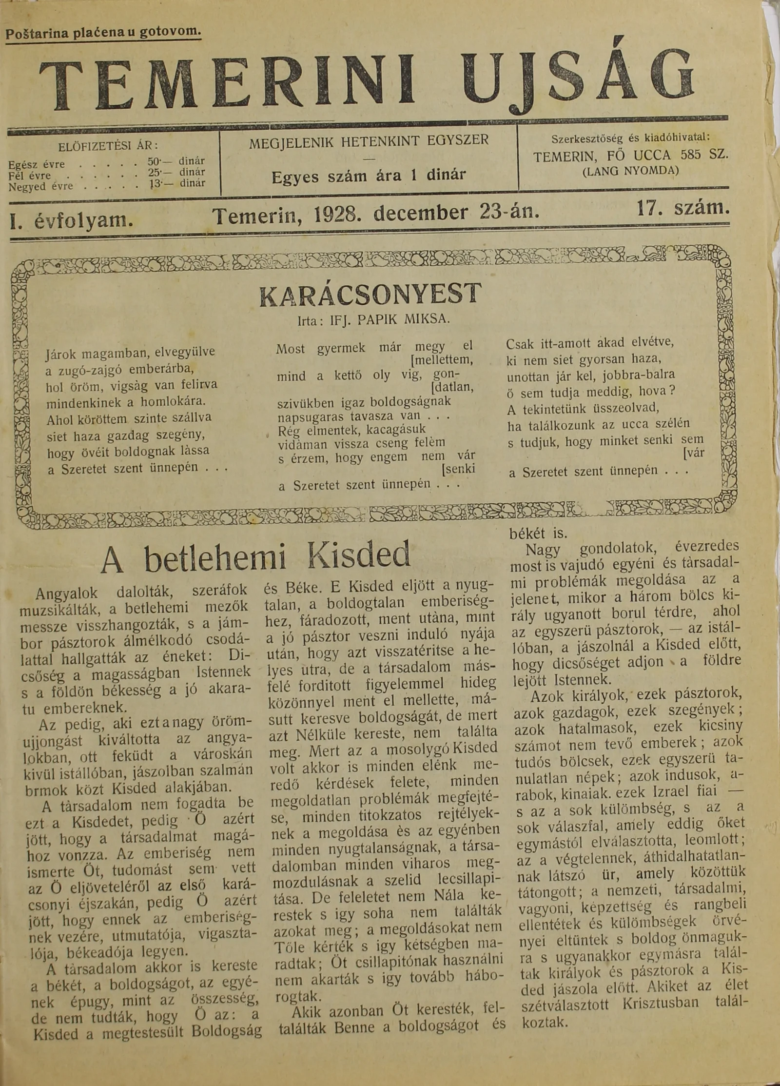 Temerini Újság 1928-1944, 1. évf. 1928. december 23. 17. sz.