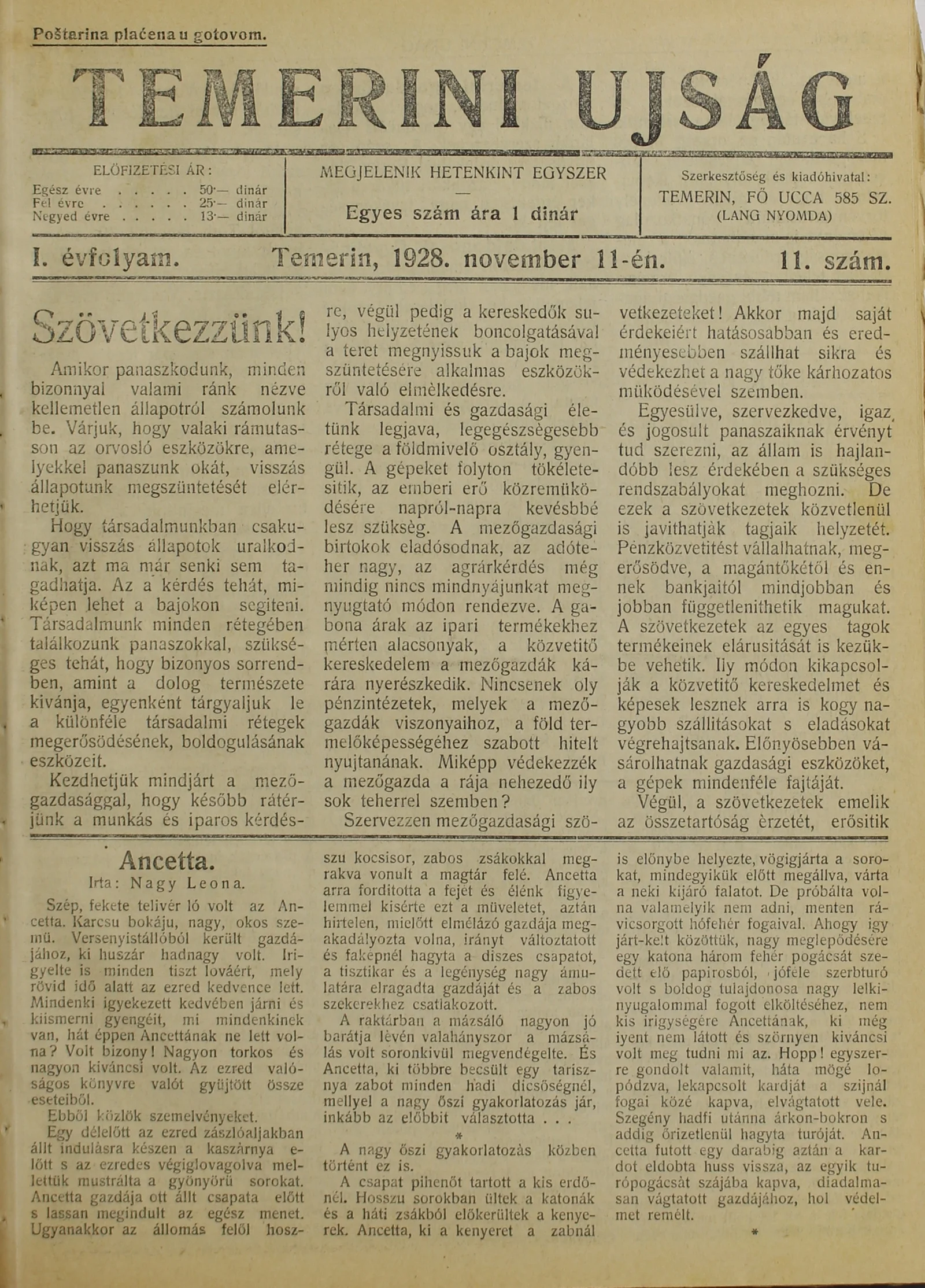 Temerini Újság 1928-1944, 1. évf. 1928. november 11. 11. sz.