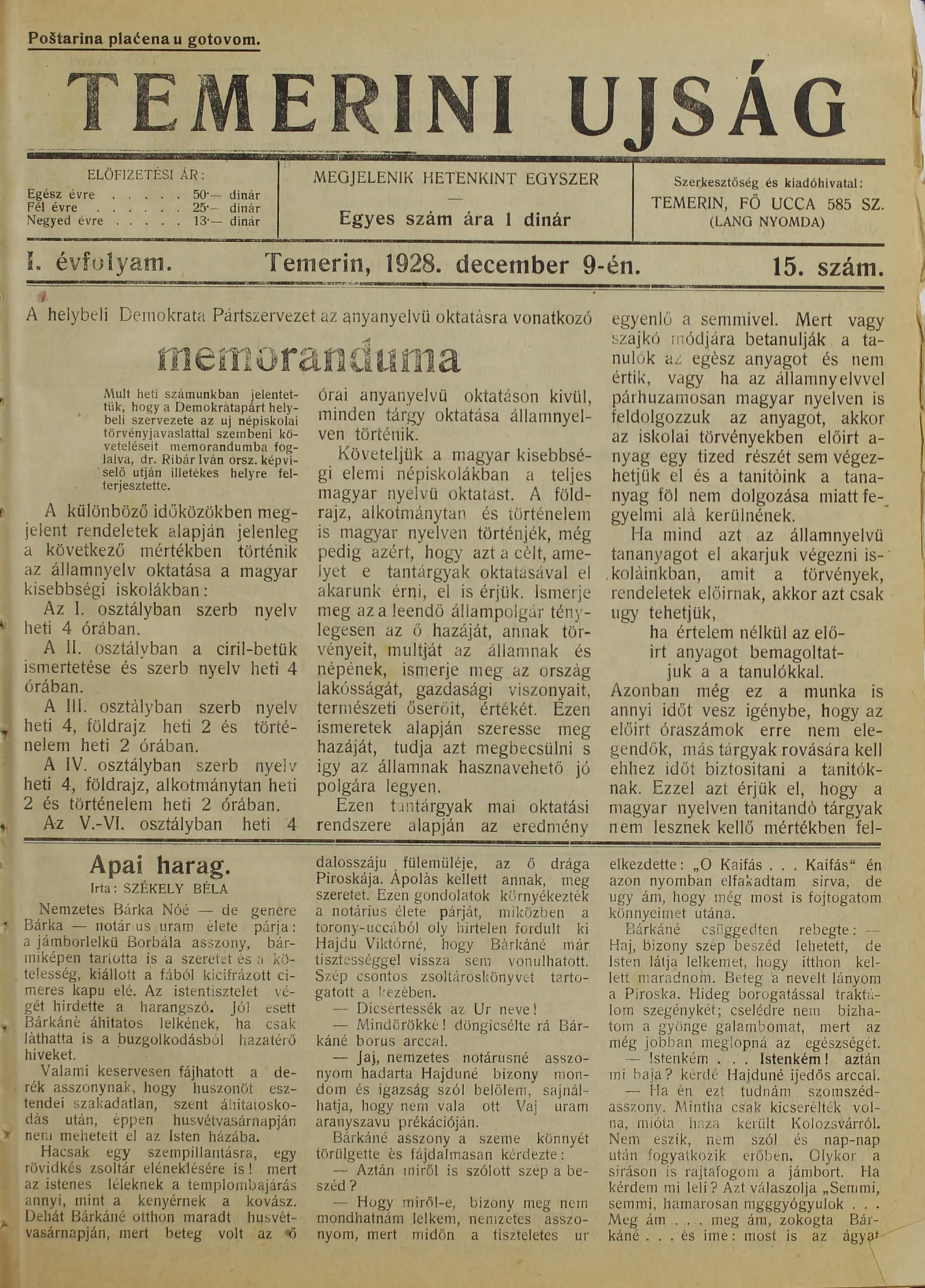 Temerini Újság 1928-1944, 1. évf. 1928. november 9. 15. sz.