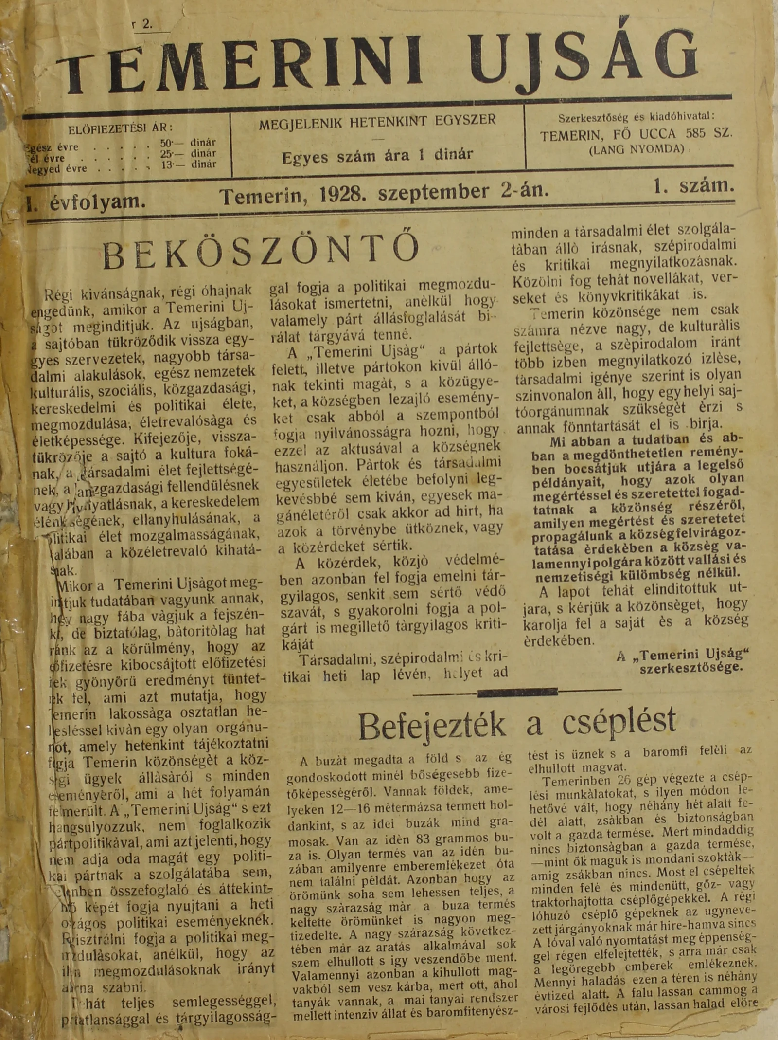 Temerini Újság 1928-1944, 1. évf. 1928. szeptember 2. 1. sz. 1–6. oldal