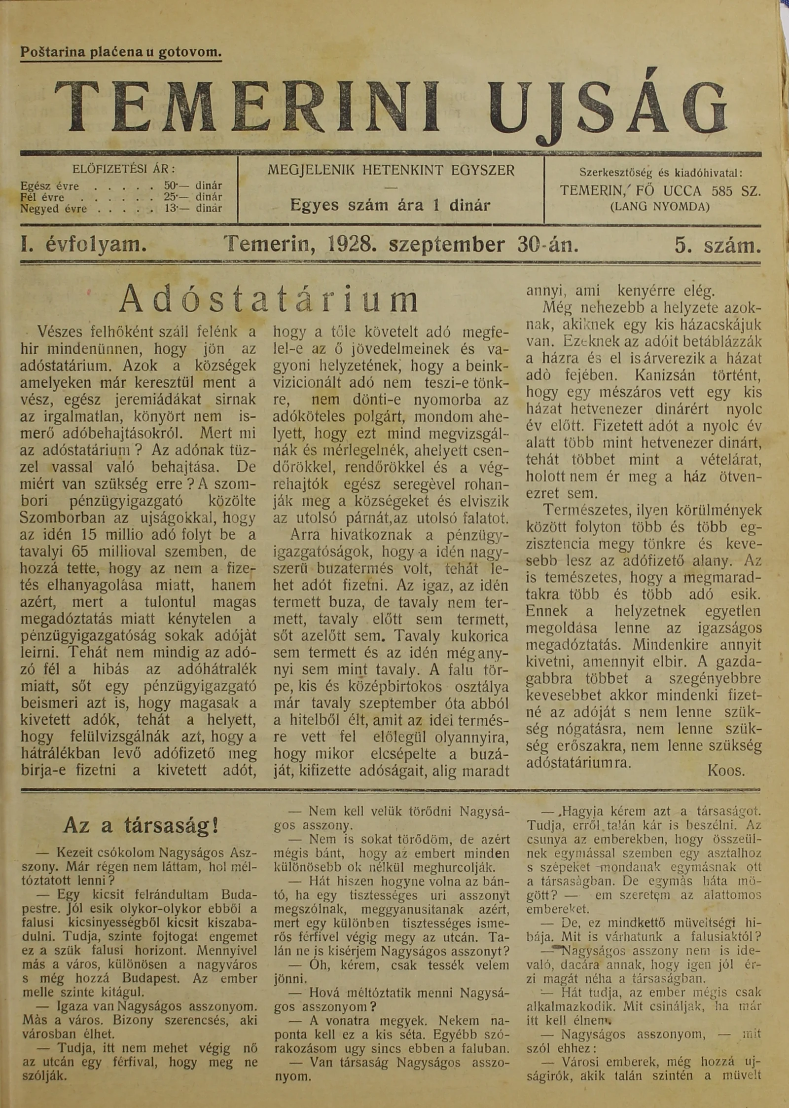 Temerini Újság 1928-1944, 1. évf. 1928. szeptember 30. 5. sz.