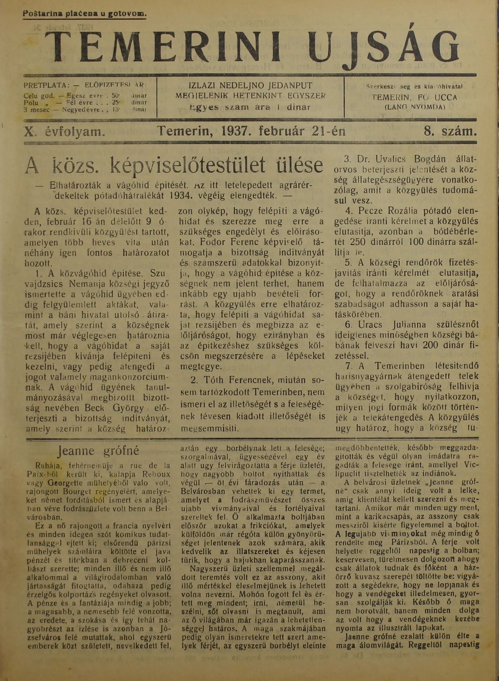 Temerini Újság 1928-1944, 10. évf. 1937. február 21. 8. sz.