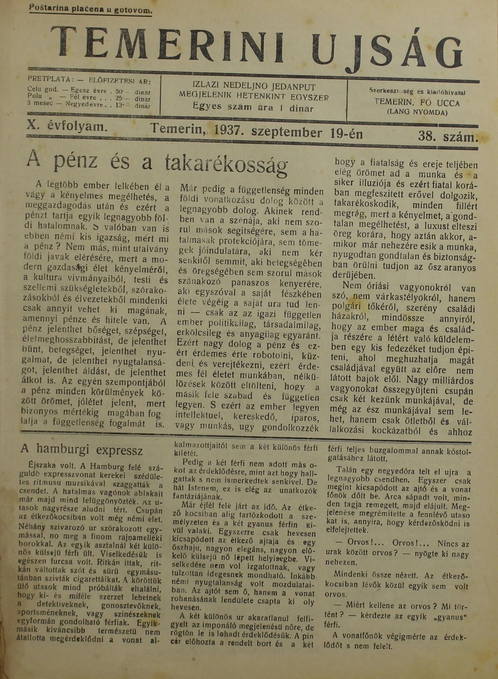 Temerini Újság 1928-1944, 10. évf. 1937. szeptember 19. 38. sz.
