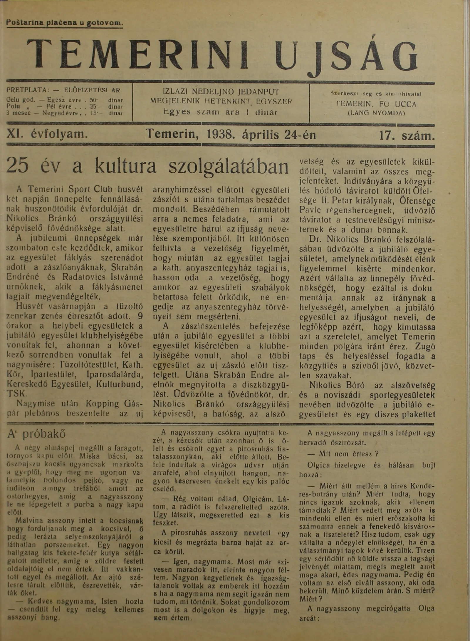 Temerini Újság 1928-1944, 11. évf. 1938. április 24. 17. sz.