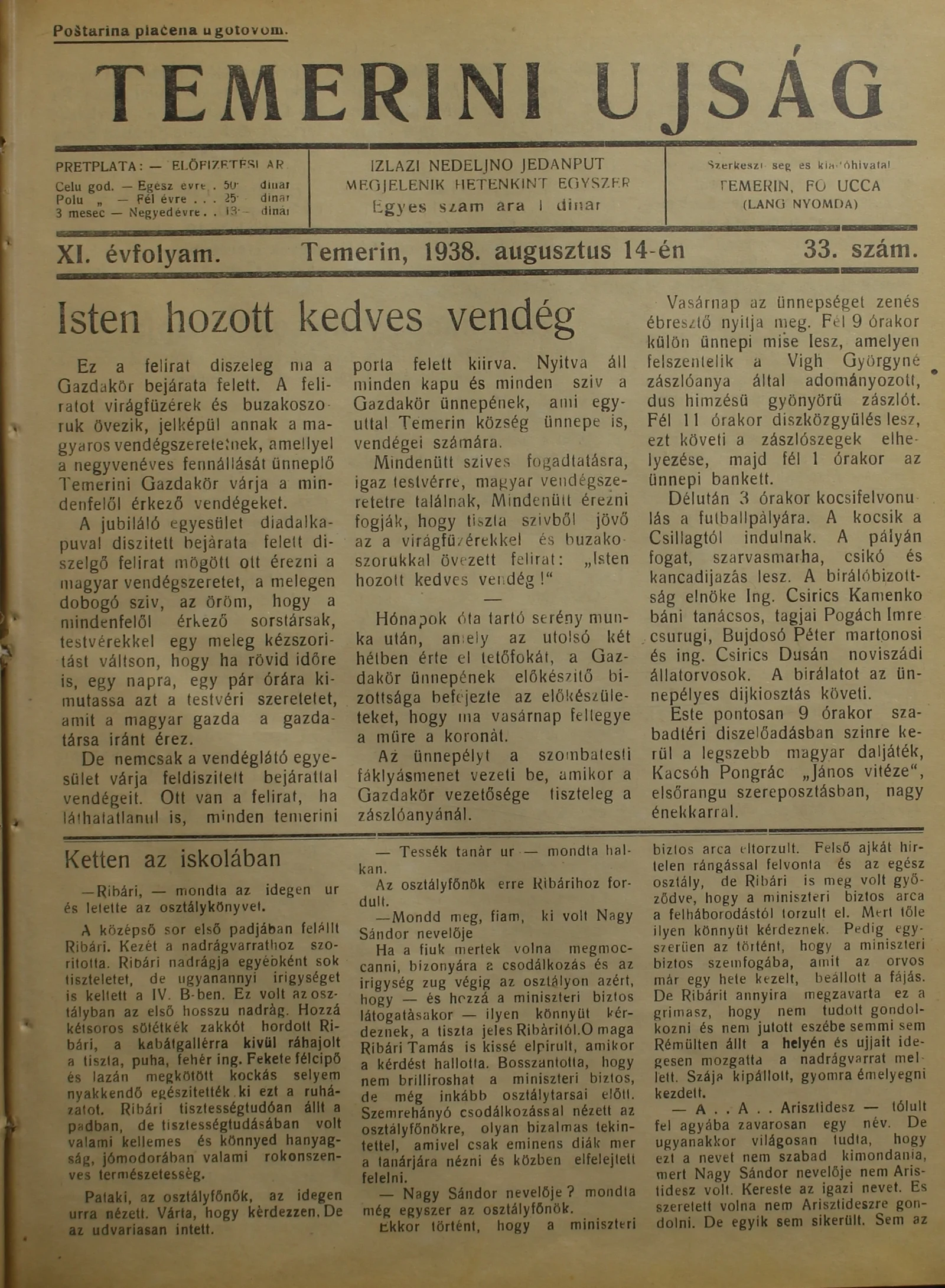 Temerini Újság 1928-1944, 11. évf. 1938. augusztus 14. 33. sz.