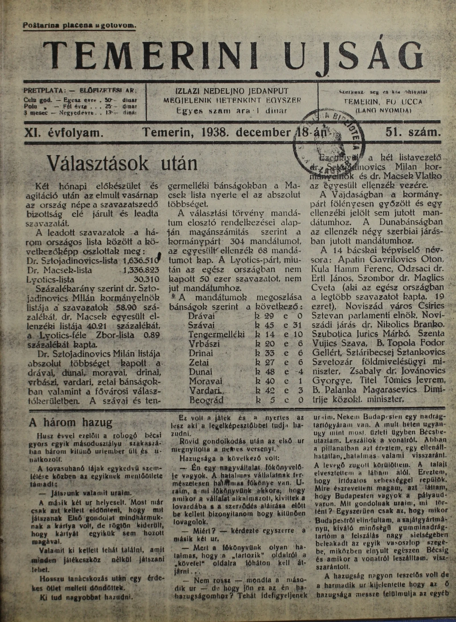 Temerini Újság 1928-1944, 11. évf. 1938. december 18. 51. sz.