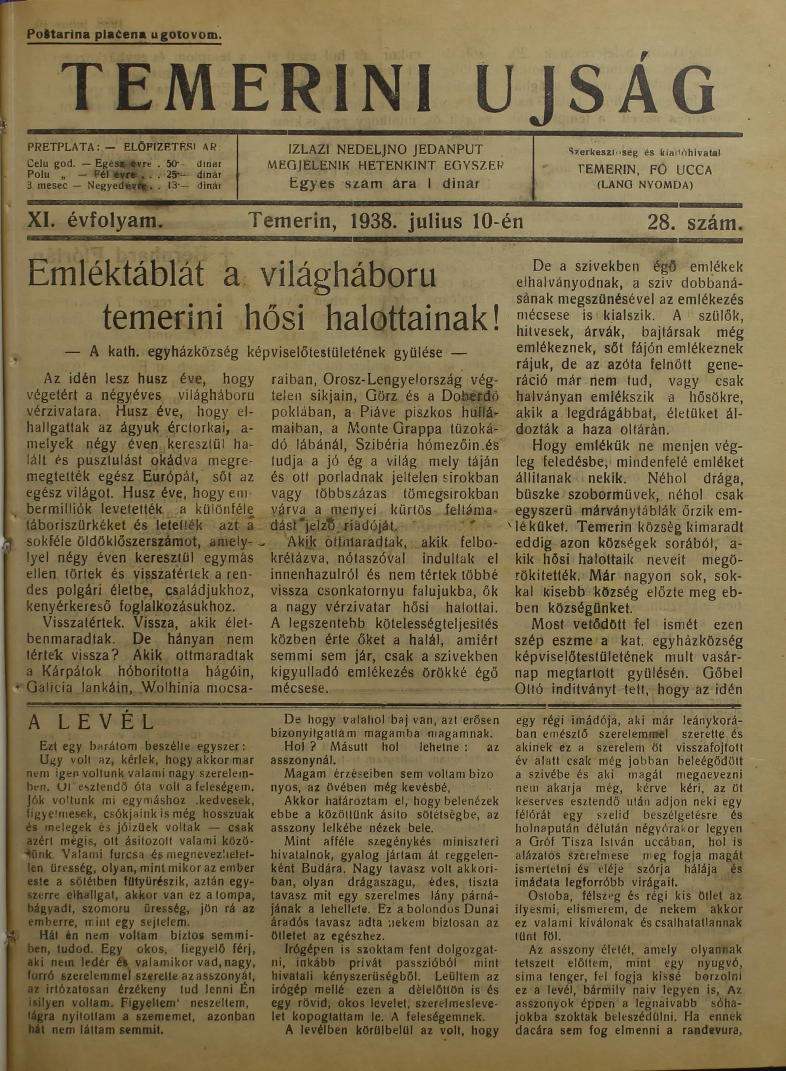 Temerini Újság 1928-1944, 11. évf. 1938. július 10. 28. sz.