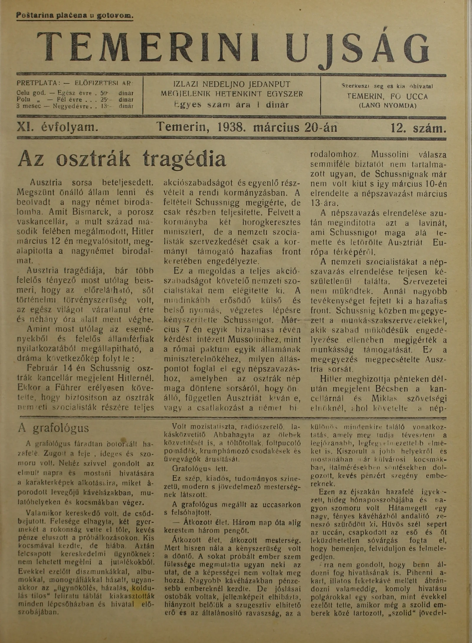 Temerini Újság 1928-1944, 11. évf. 1938. március 20. 12. sz.