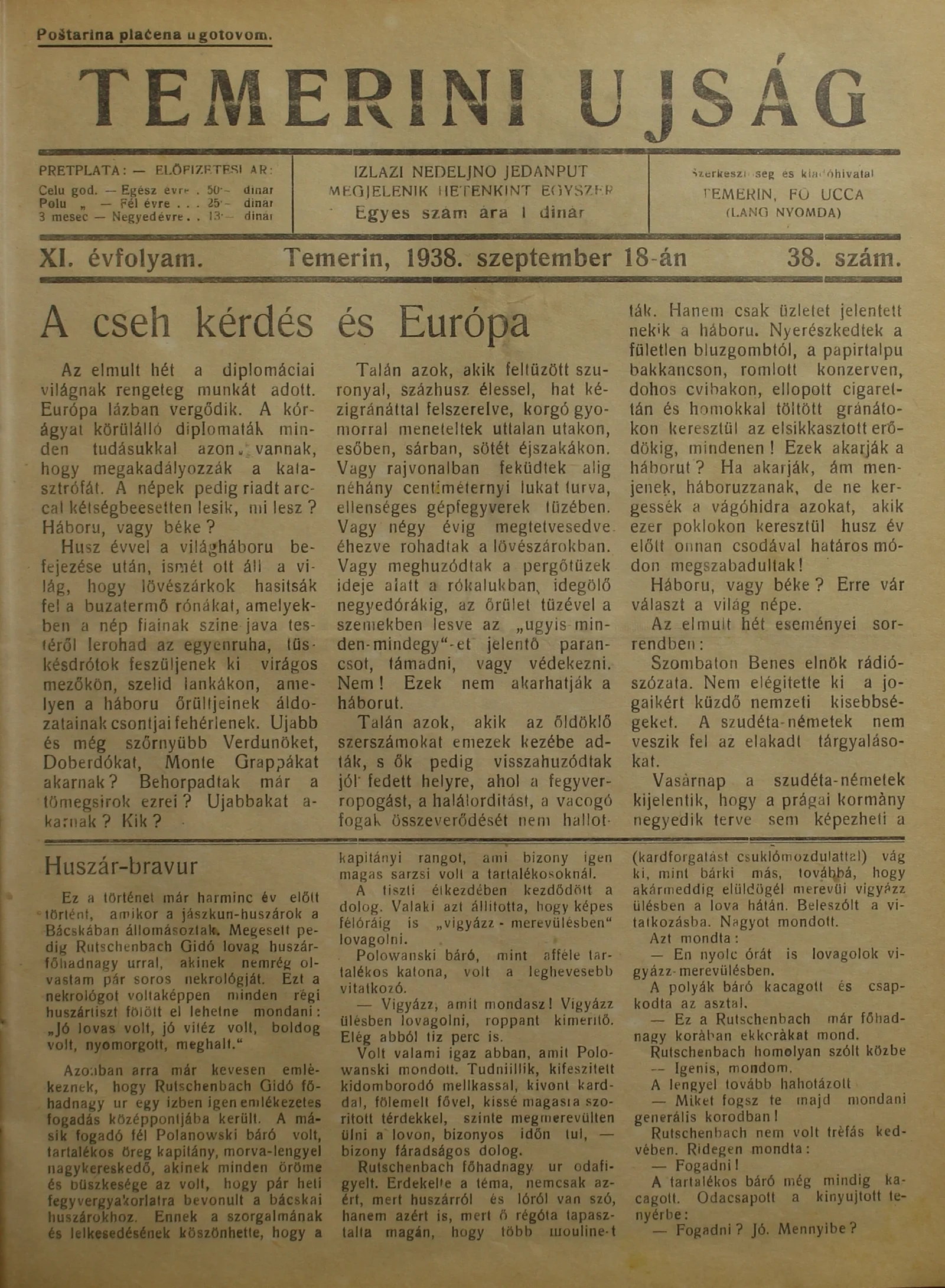 Temerini Újság 1928-1944, 11. évf. 1938. szeptember 18. 38. sz.