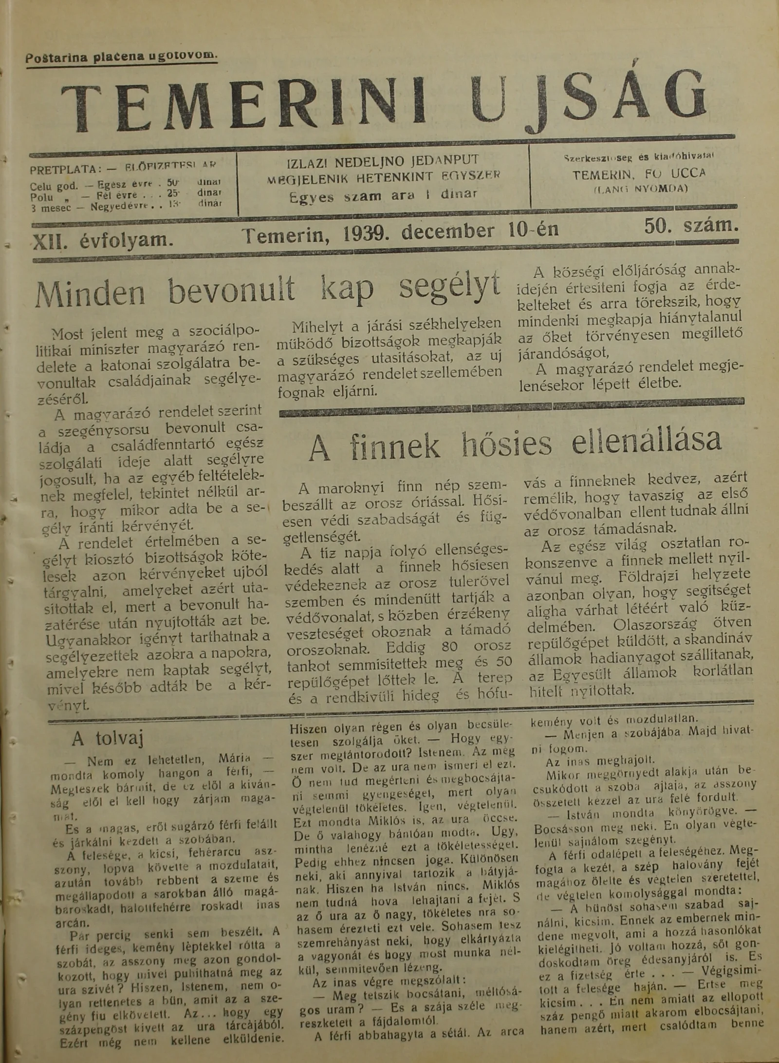 Temerini Újság 1928-1944, 12. évf. 1939. december 10. 50. sz.