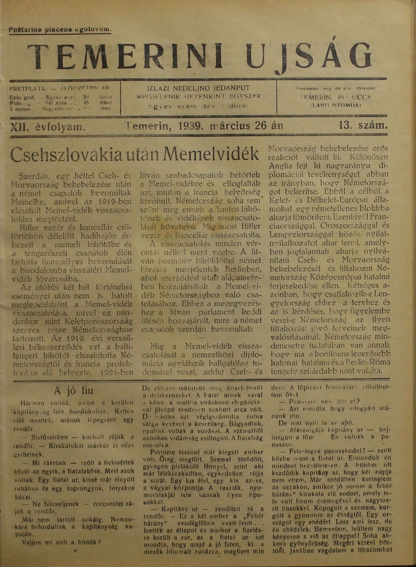 Temerini Újság 1928-1944, 12. évf. 1939. március 26. 13. sz.