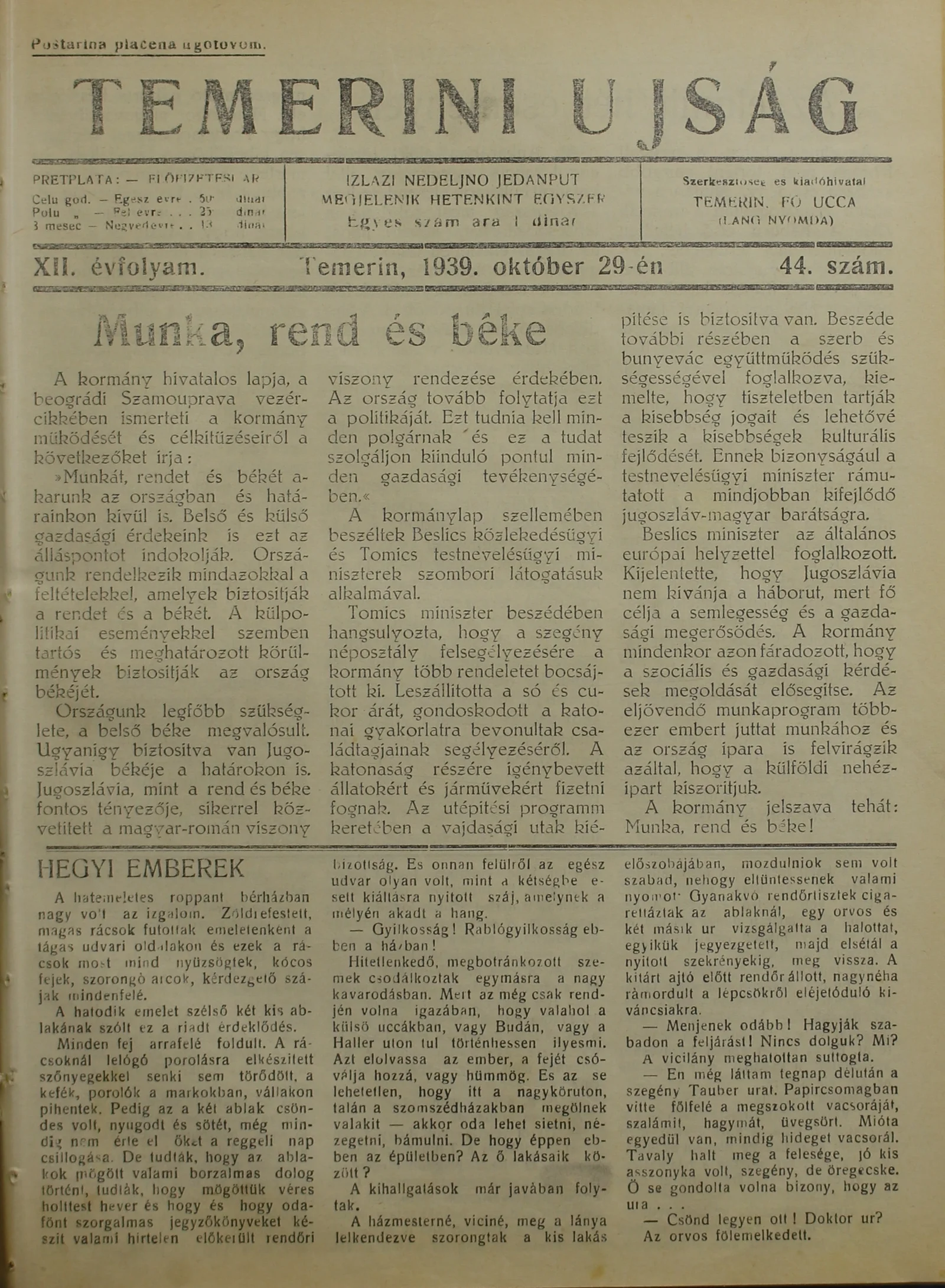 Temerini Újság 1928-1944, 12. évf. 1939. október 29. 44. sz.