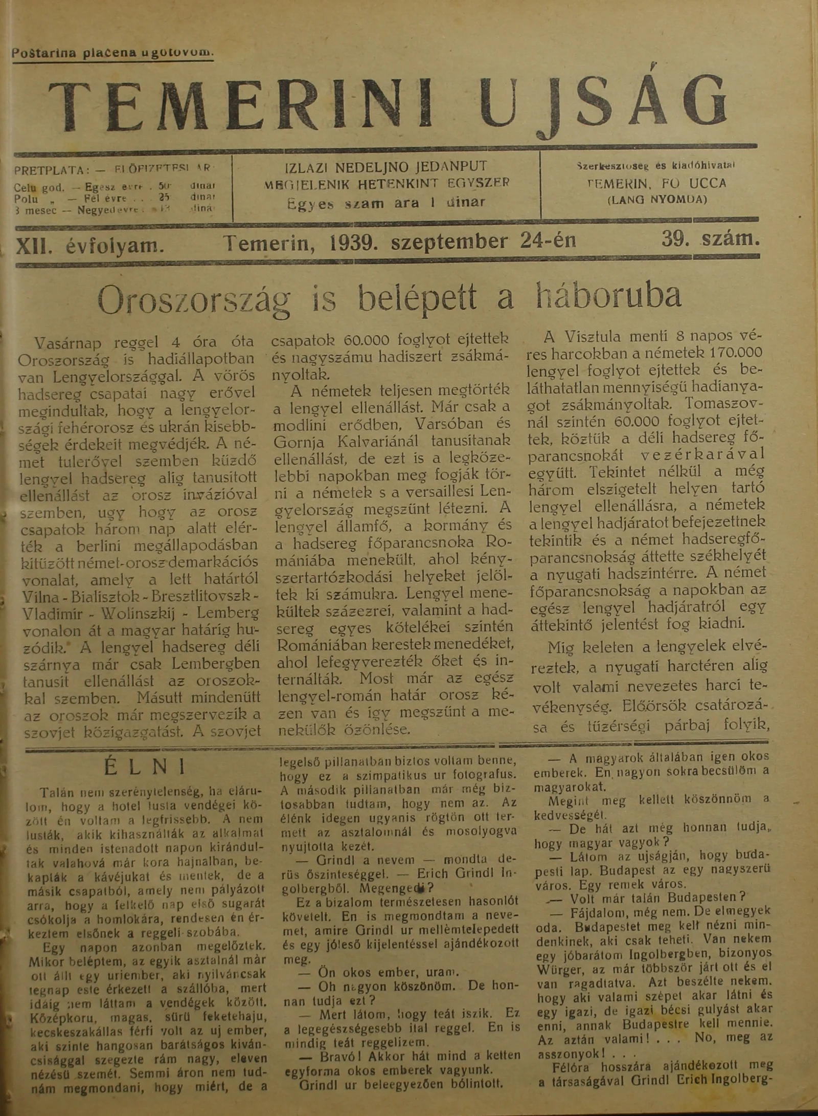 Temerini Újság 1928-1944, 12. évf. 1939. szeptember 24. 39. sz.