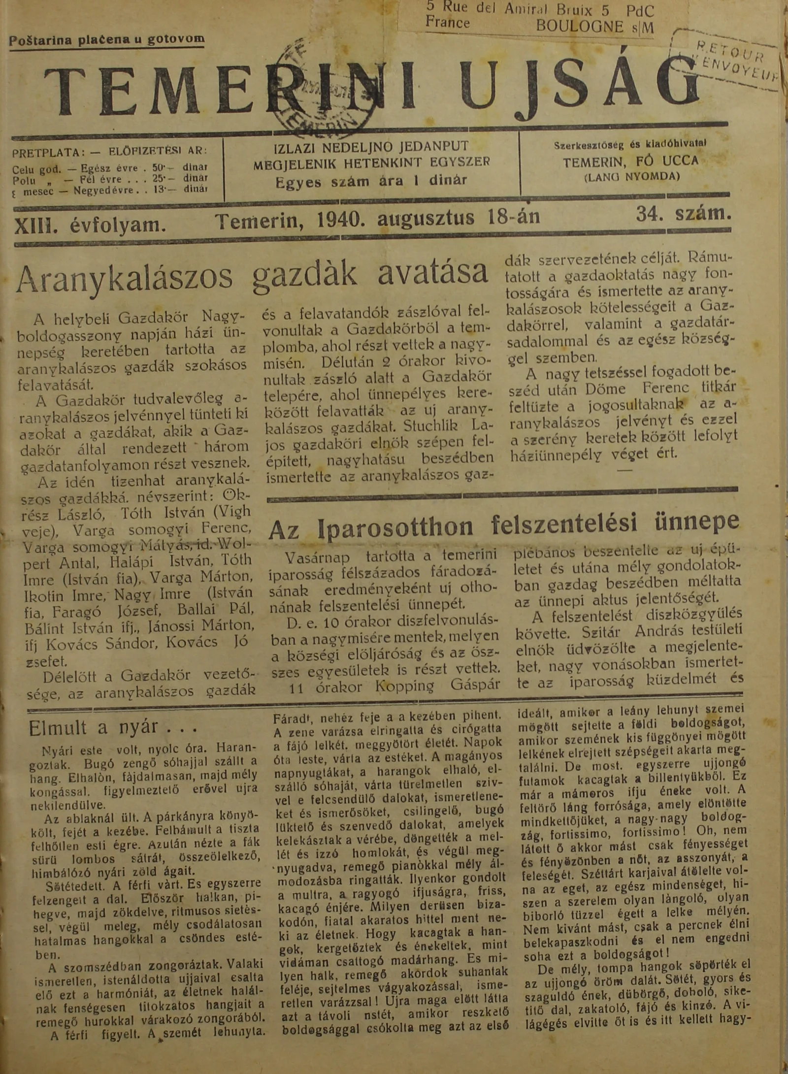 Temerini Újság 1928-1944, 13. évf. 1940. augusztus 18. 34. sz.