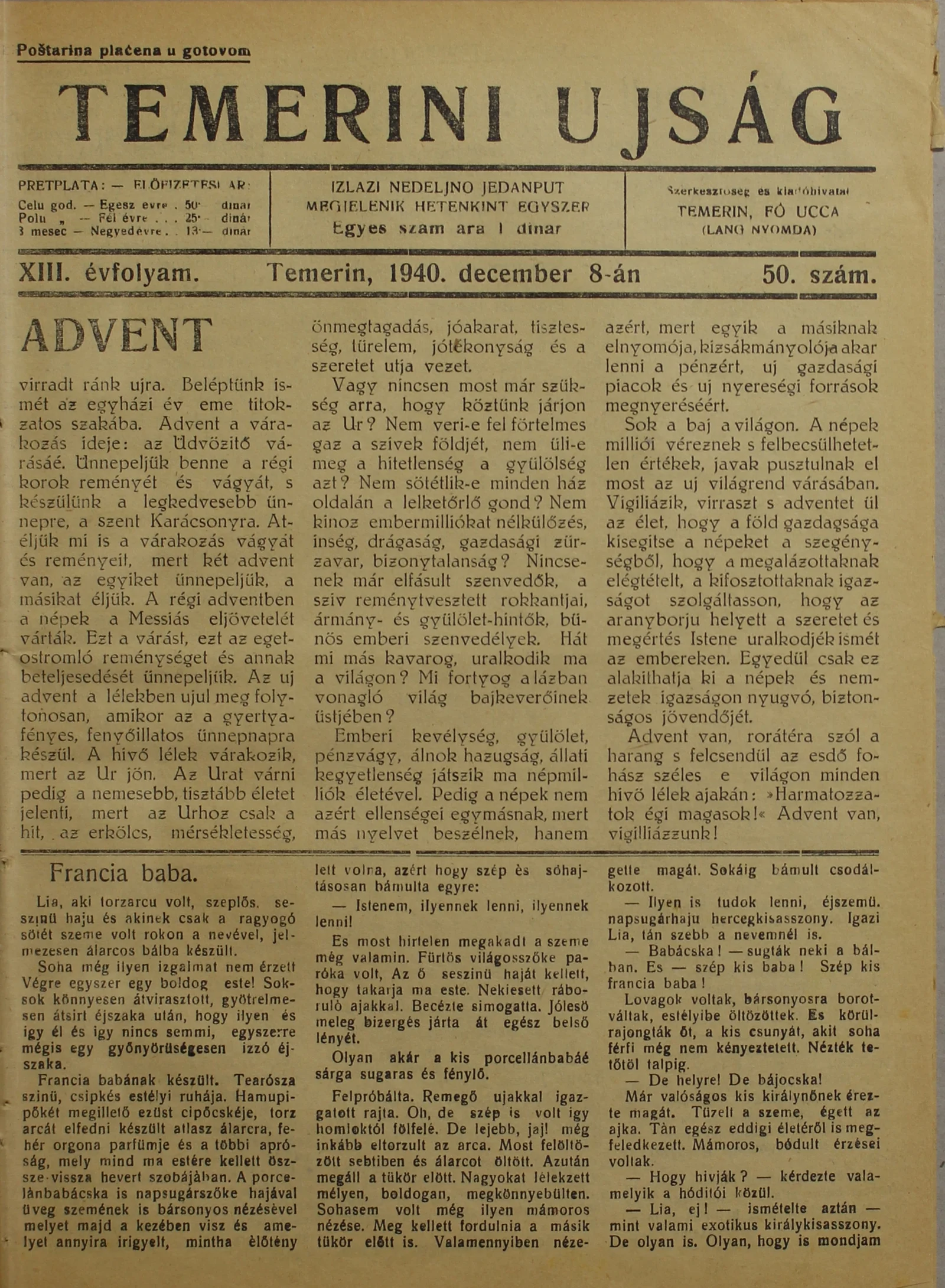 Temerini Újság 1928-1944, 13. évf. 1940. december 8. 50. sz.