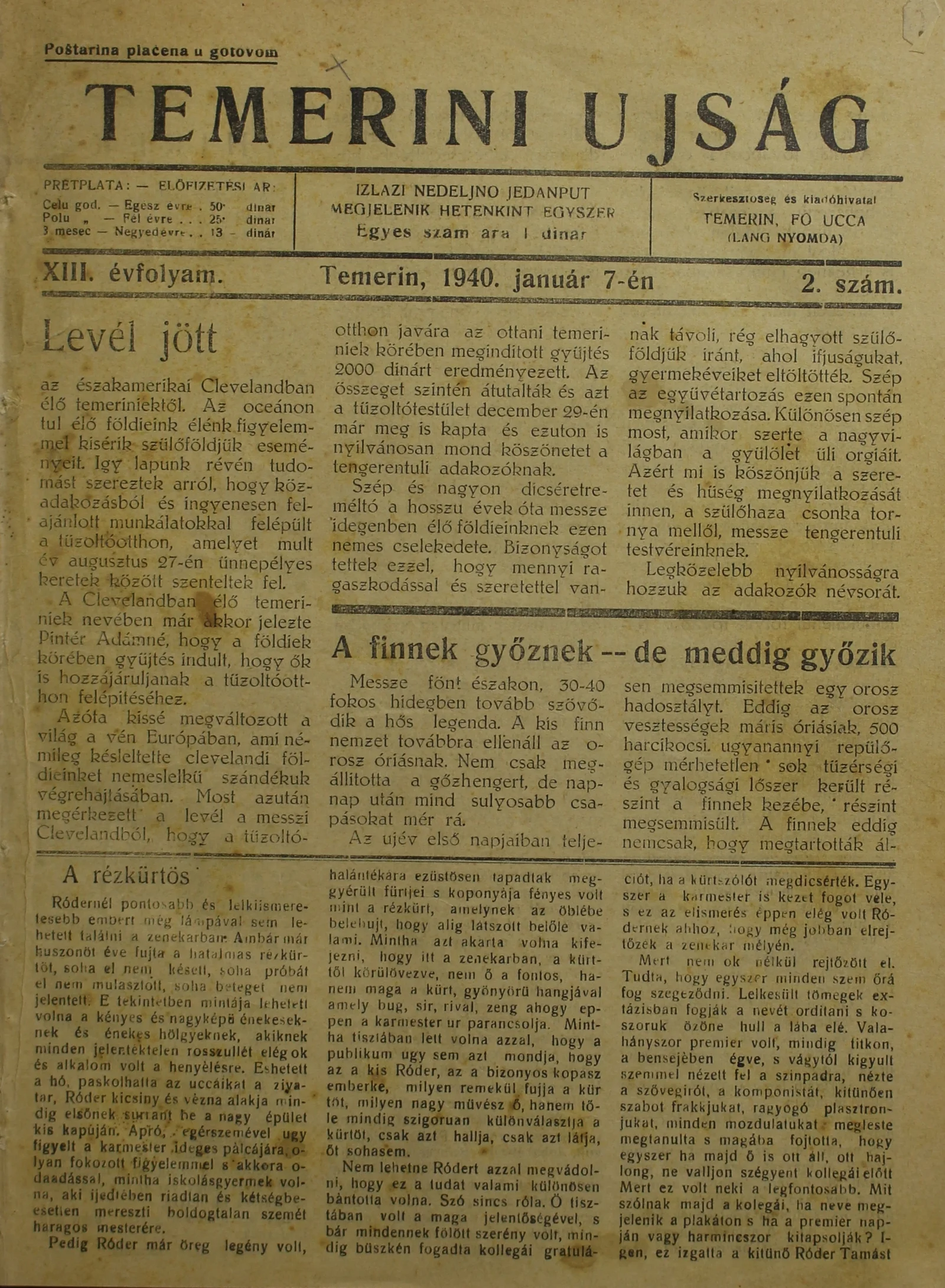 Temerini Újság 1928-1944, 13. évf. 1940. január 7. 2. sz.