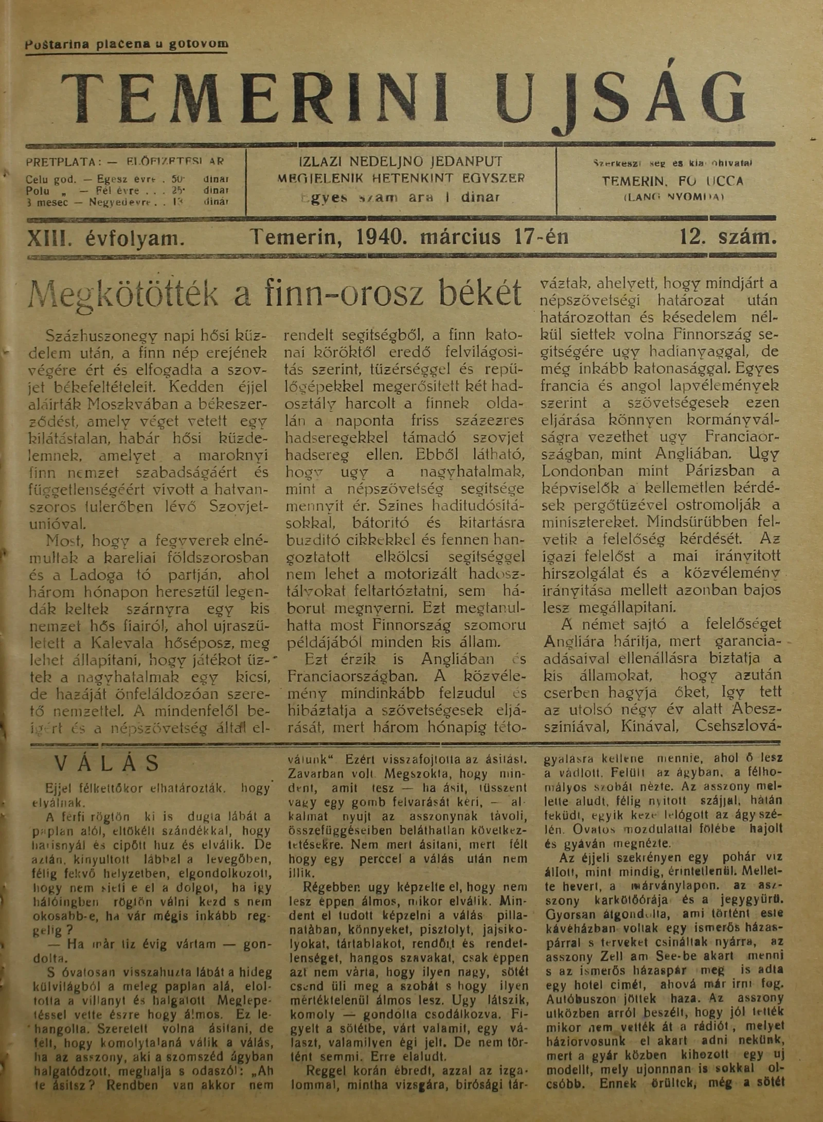 Temerini Újság 1928-1944, 13. évf. 1940. március 17. 12. sz.