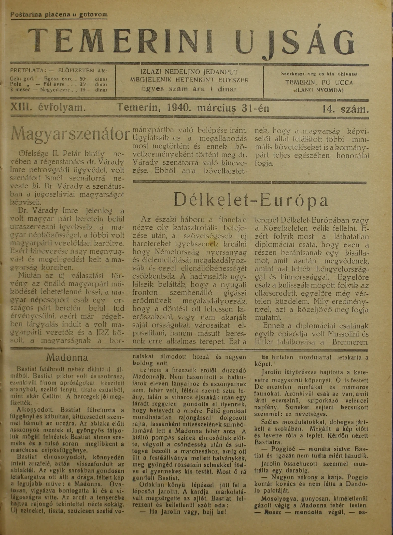 Temerini Újság 1928-1944, 13. évf. 1940. március 31. 14. sz.