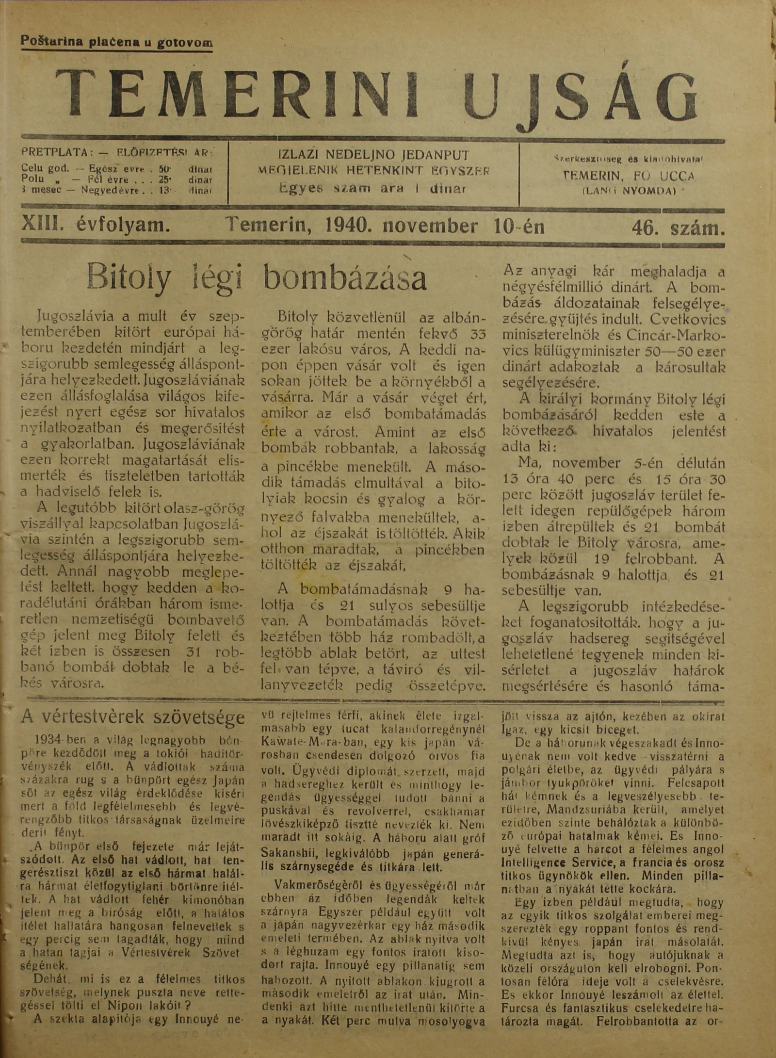 Temerini Újság 1928-1944, 13. évf. 1940. november 10. 46. sz.