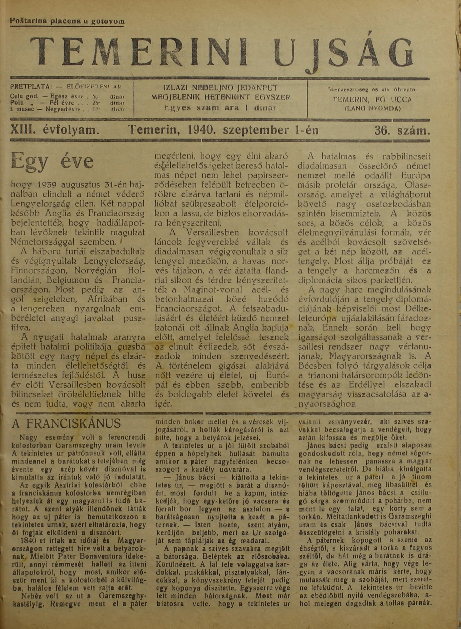 Temerini Újság 1928-1944, 13. évf. 1940. szeptember 1. 36. sz.