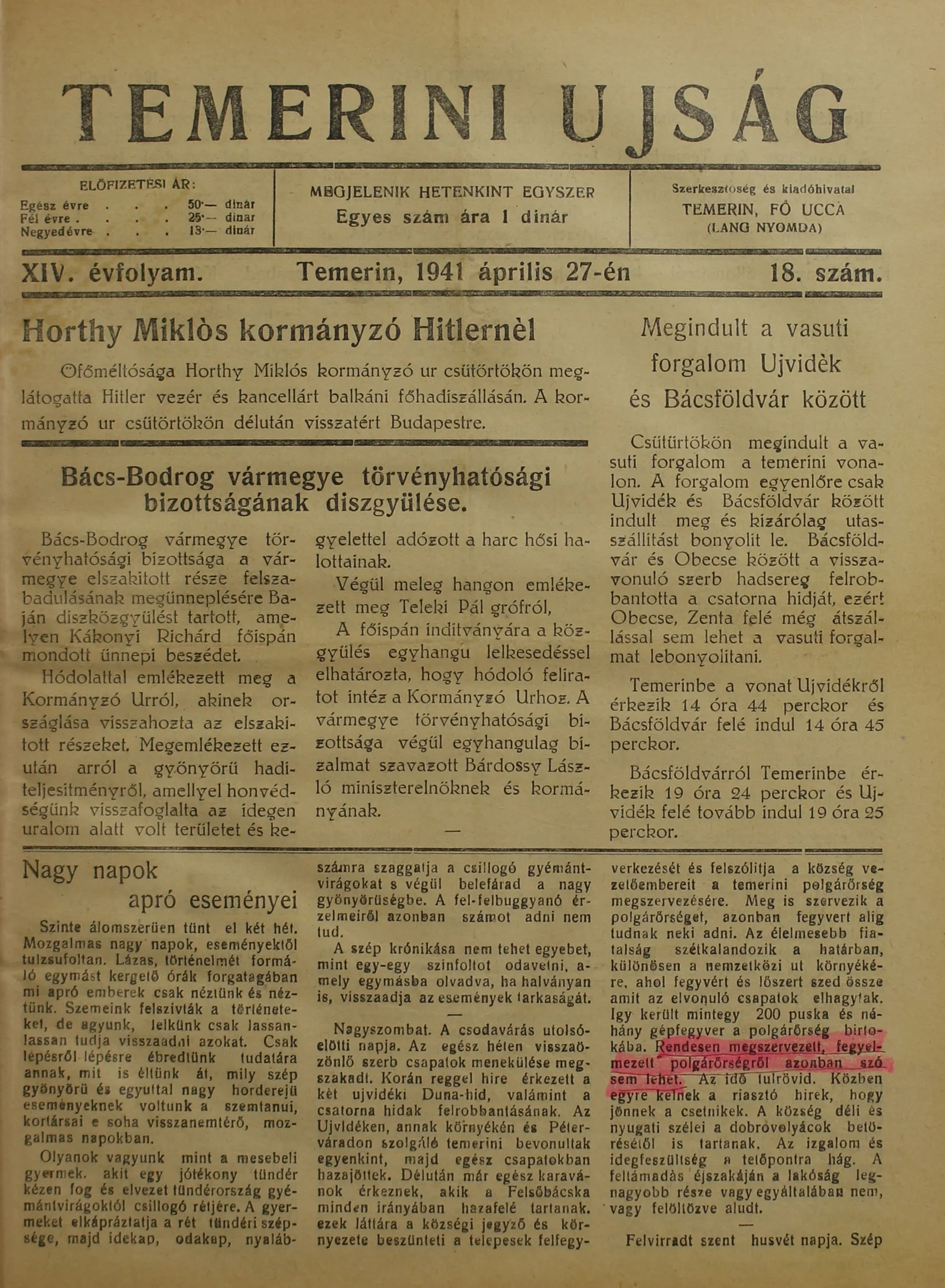 Temerini Újság 1928-1944, 14. évf. 1941. április 27. 18. sz.