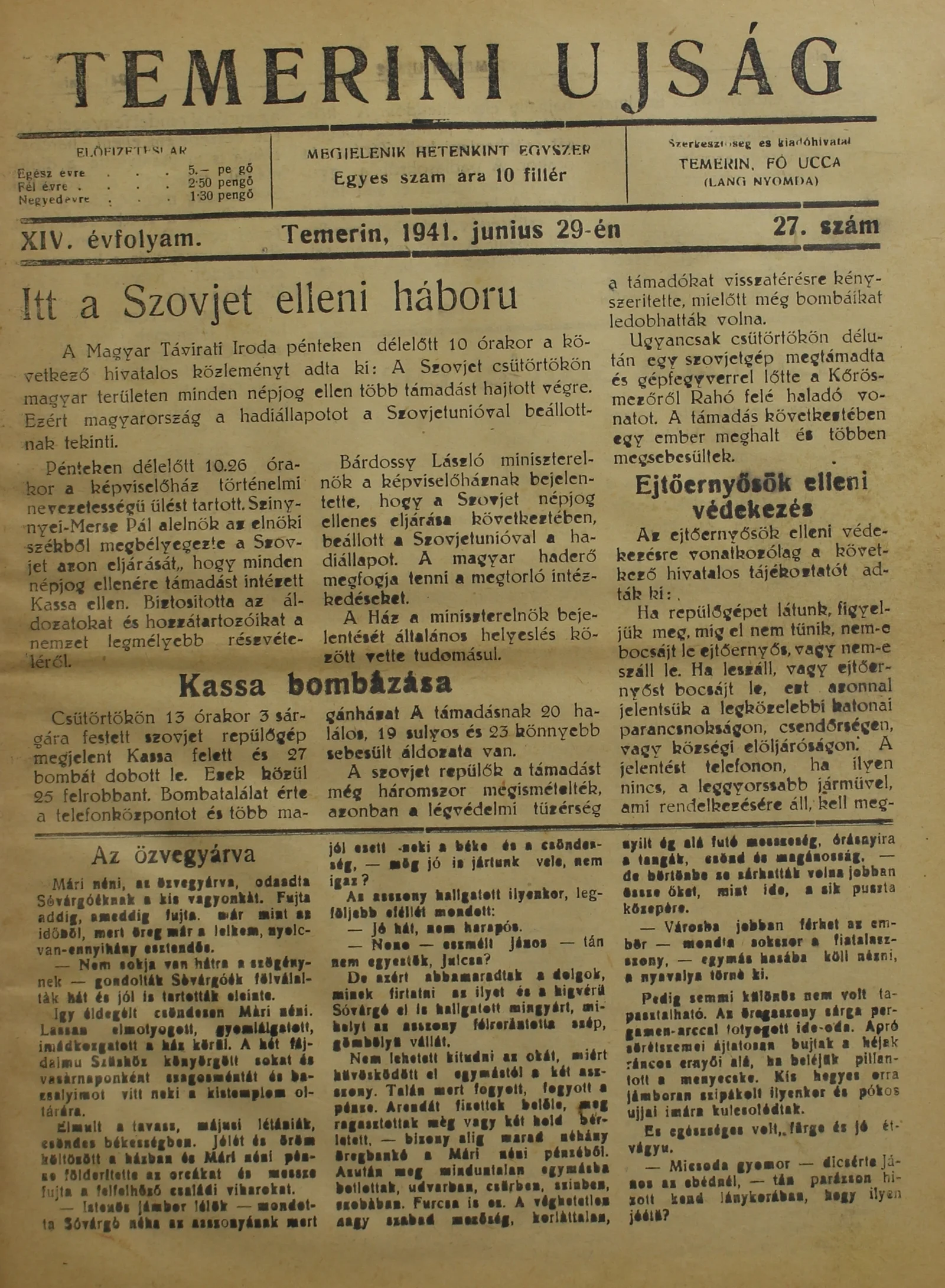 Temerini Újság 1928-1944, 14. évf. 1941. június 29. 27. sz.