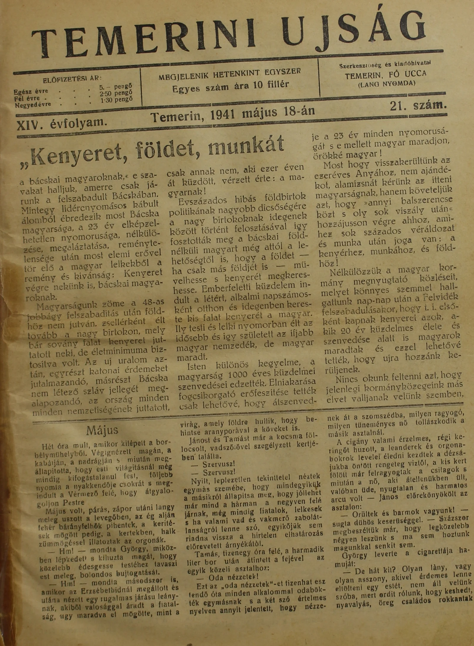 Temerini Újság 1928-1944, 14. évf. 1941. május 18. 21. sz.