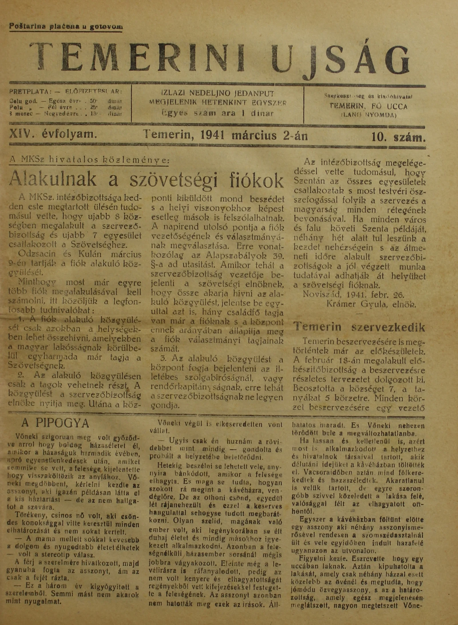 Temerini Újság 1928-1944, 14. évf. 1941. március 2. 10. sz.