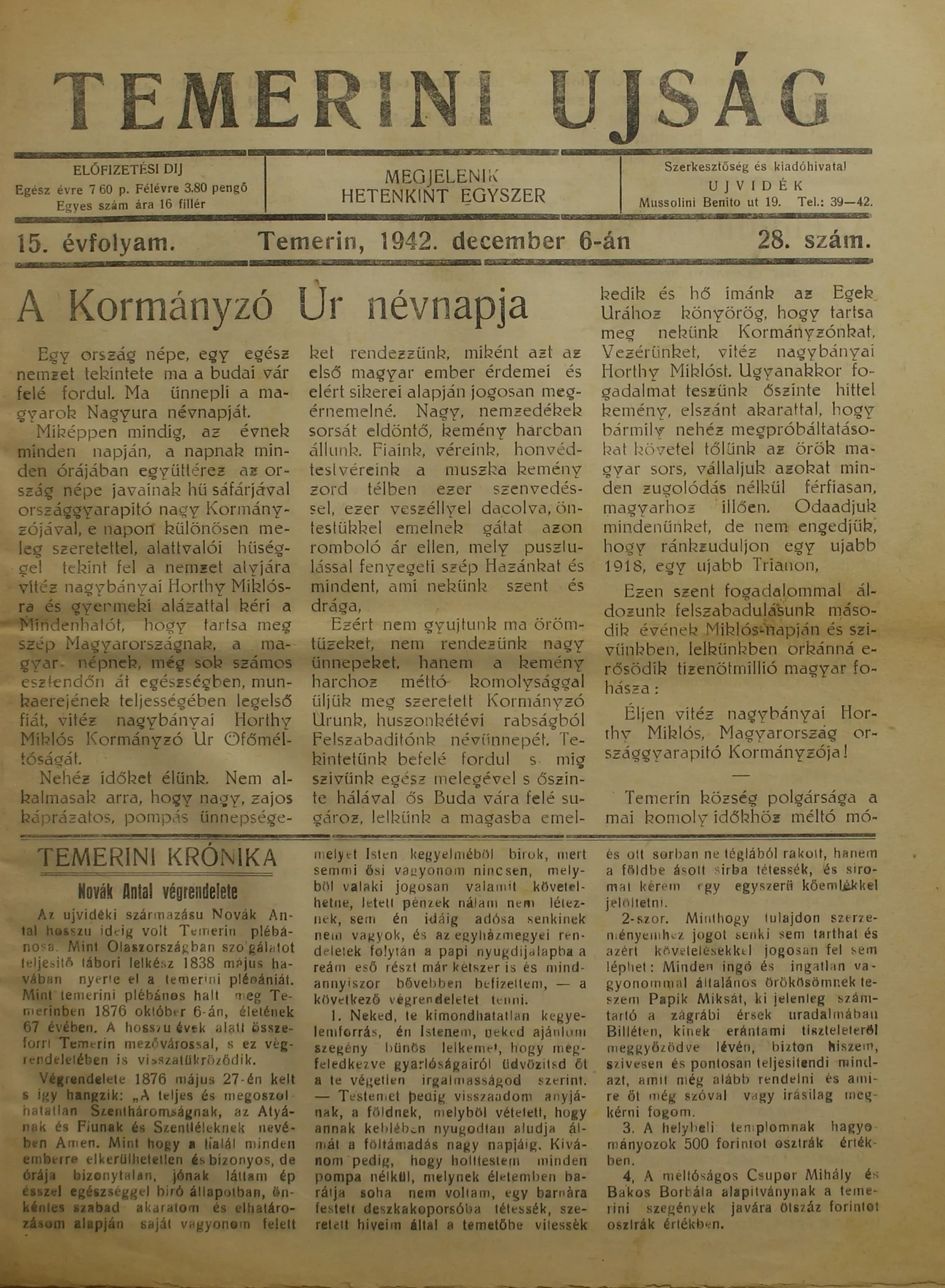 Temerini Újság 1928-1944, 15. évf. 1942. december 6. 28. sz.
