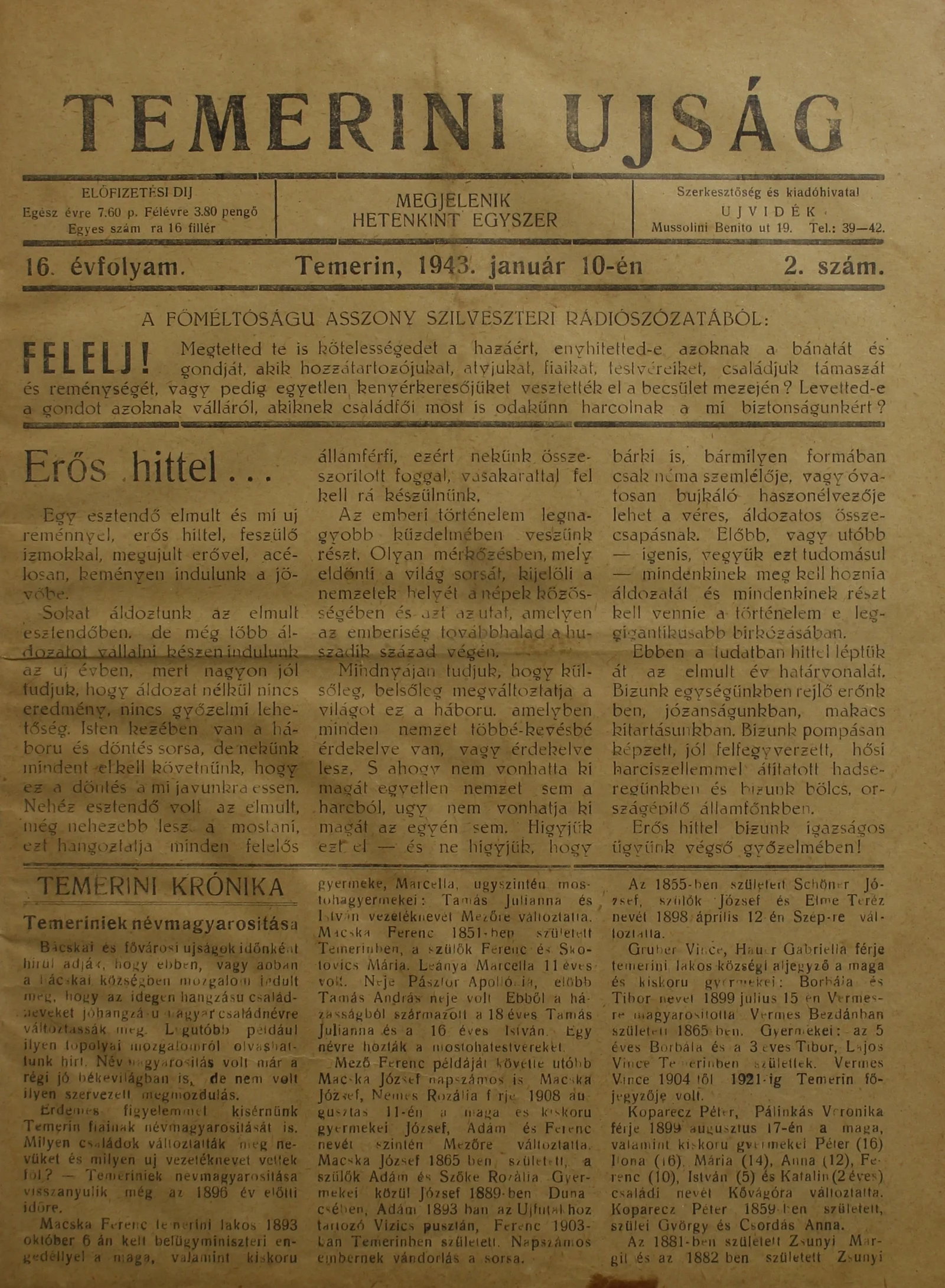 Temerini Újság 1928-1944, 16. évf. 1943. január 10. 2. sz.