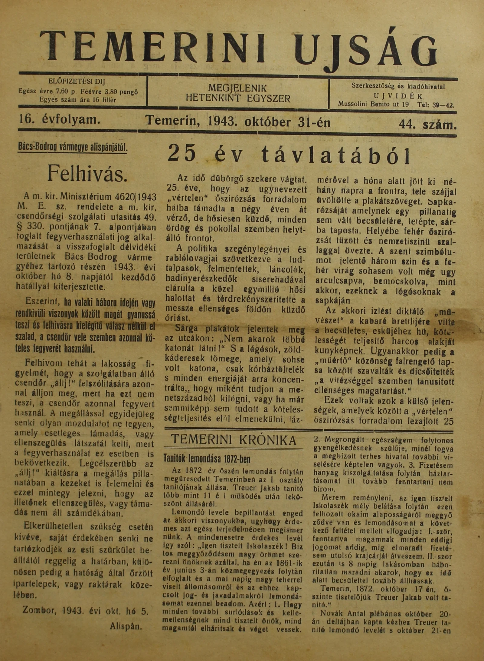 Temerini Újság 1928-1944, 16. évf. 1943. október 31. 44. sz.