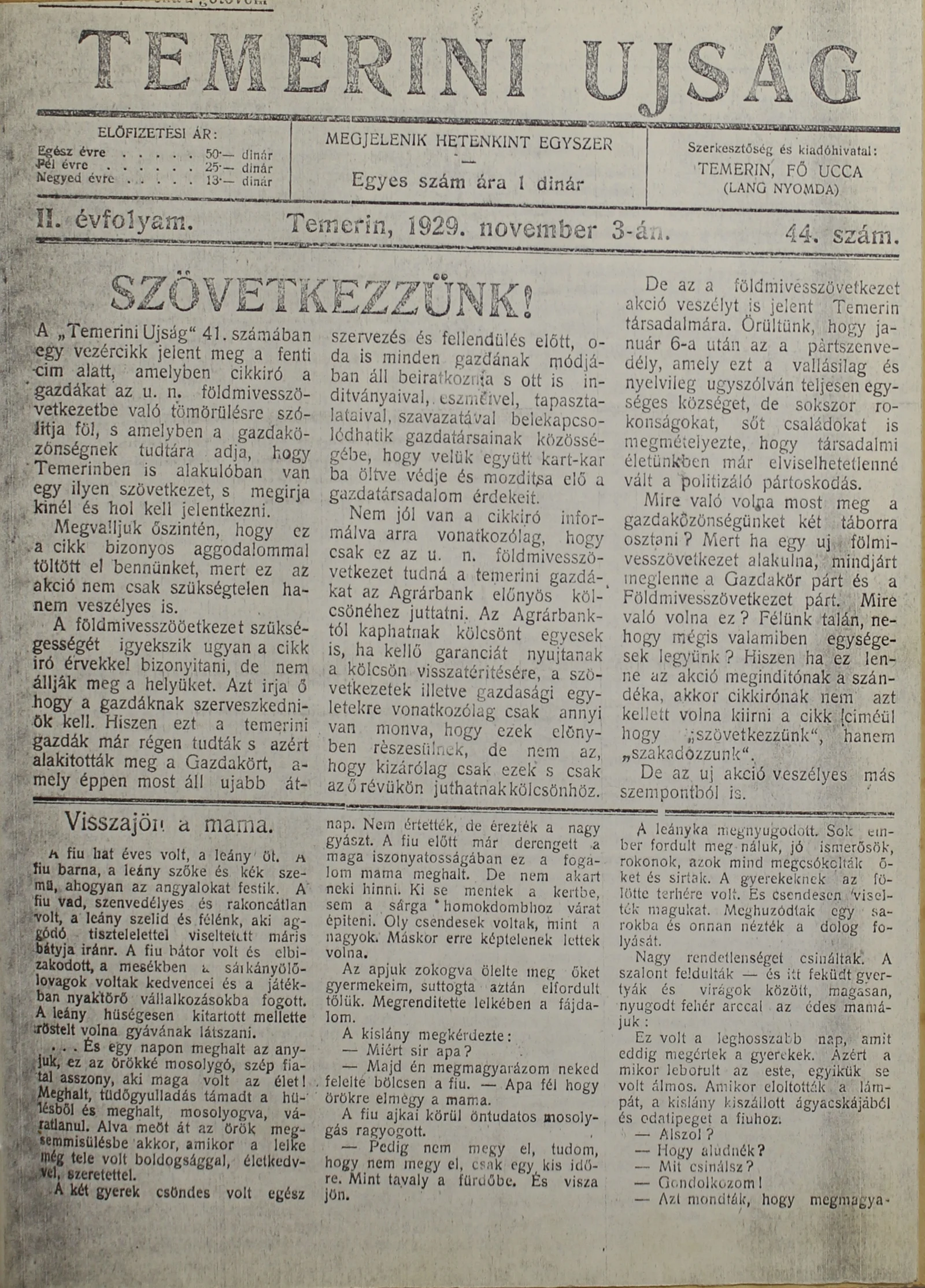 Temerini Újság 1928-1944, 2. évf. 1929. november 3. 44. sz.